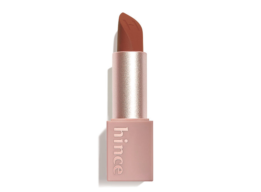 暗めの赤茶リップを中心から指で伸ばしてグラデっぽく色づけ。黒のアイラインをやめて目元の印象が弱まった分、リップで顔にメリハリを。