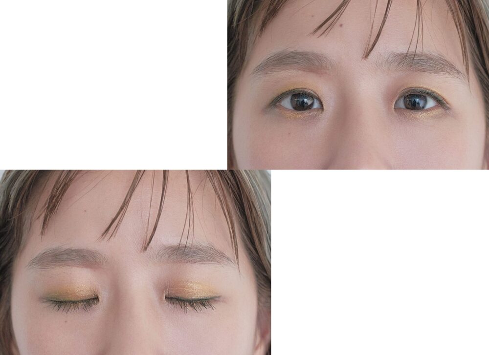 イエローのラメシャドウを上下まぶたに塗布し、カーキのアイラインでゆるく引き締める。眉の色は濃くせず、太さを出しながら丁寧にきりりとした形を描く。