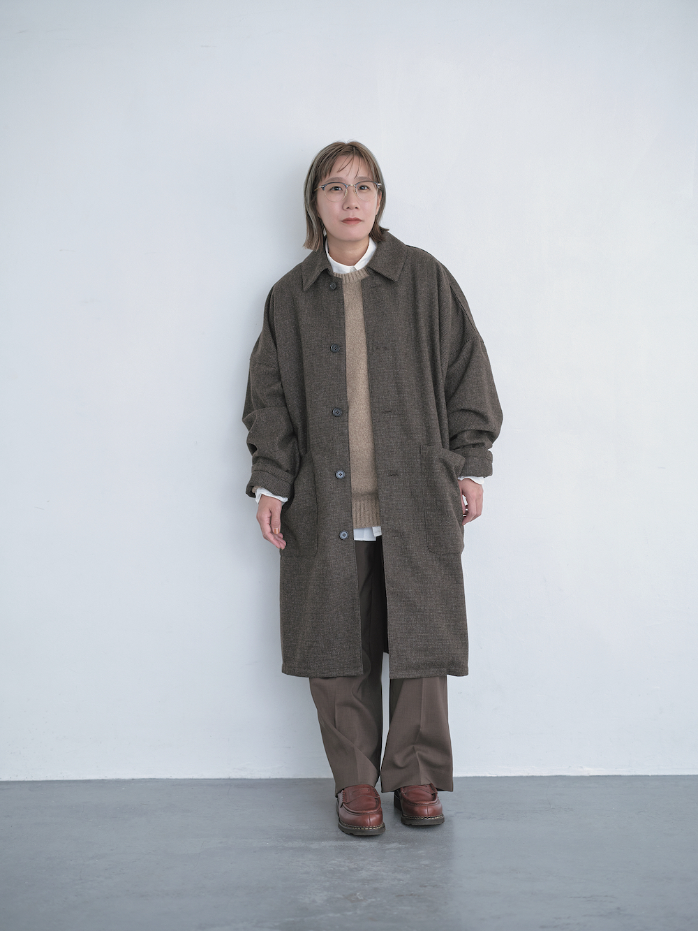 コート 27,500円/YARMO THE UNIFORM(グラストンベリー ショールーム) ユーズドニット 3,850円/原宿シカゴ 原宿店 シャツ 27,500円/KICS DOCUMENT.(HEMTPR)パンツ(共布ベルトつき)4,400円/CROSS FUNCTION(クロスプラス) メガネ 57,200円/金子眼鏡(オプティシァン ロイド) ローファー 94,600円/Paraboot(パラブーツ青山店)