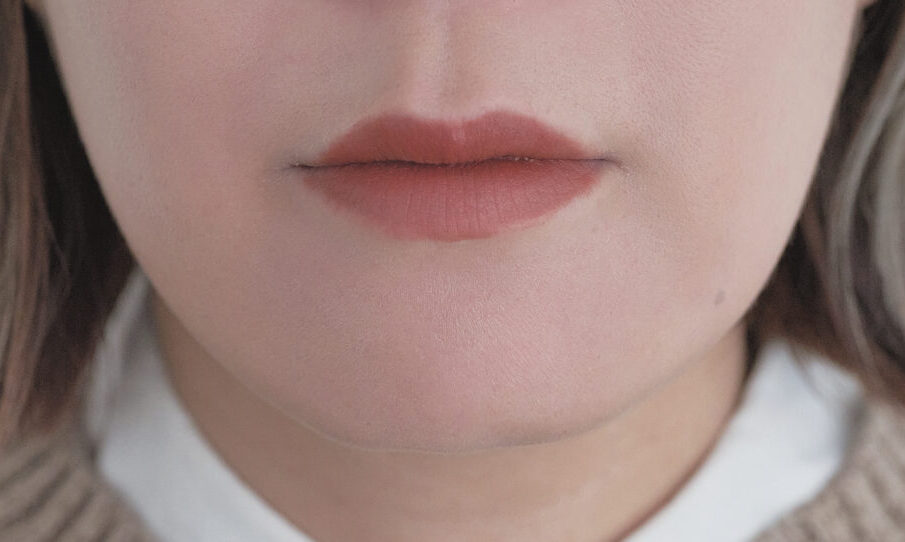 暗めの赤茶リップを中心から指で伸ばしてグラデっぽく色づけ。黒のアイラインをやめて目元の印象が弱まった分、リップで顔にメリハリを。