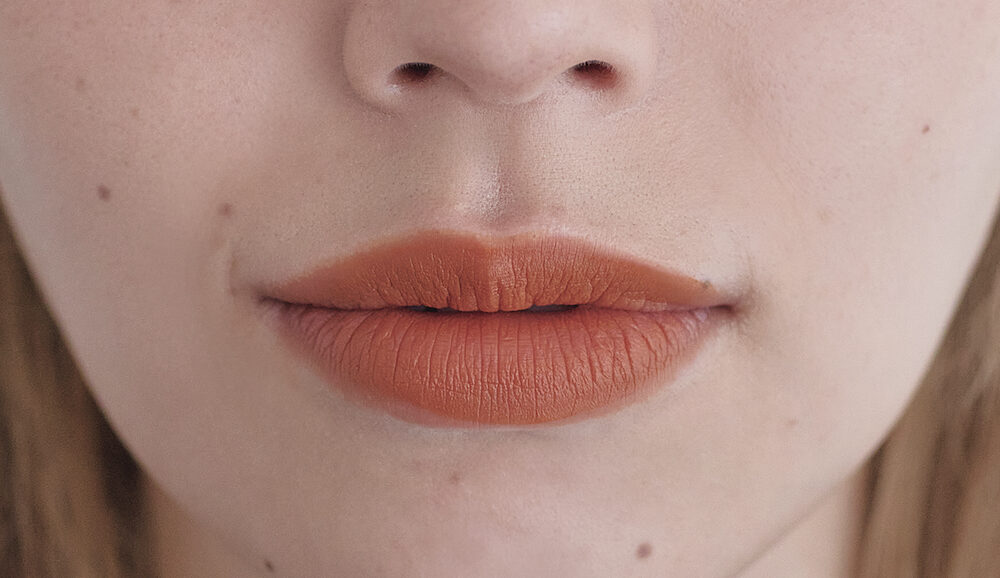 素の唇の色をファンデで消してからオレンジリップを直塗り。輪郭を指でポンポンとぼかして、カジュアルな抜け感を出すことで派手さをセーブ。