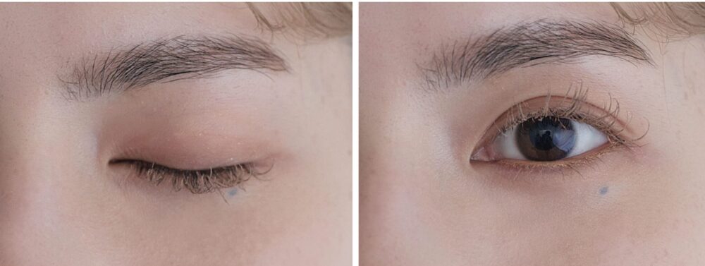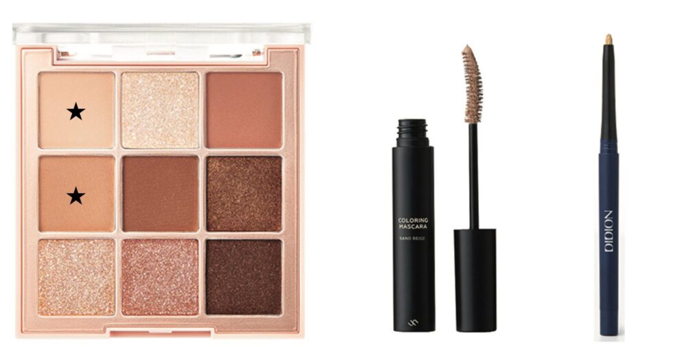 パレットの★のマットな2色を混ぜ、まぶたに陰影をつけて、ベージュマスカラを塗る。ベージュラインで下まぶたをこっそり盛る。