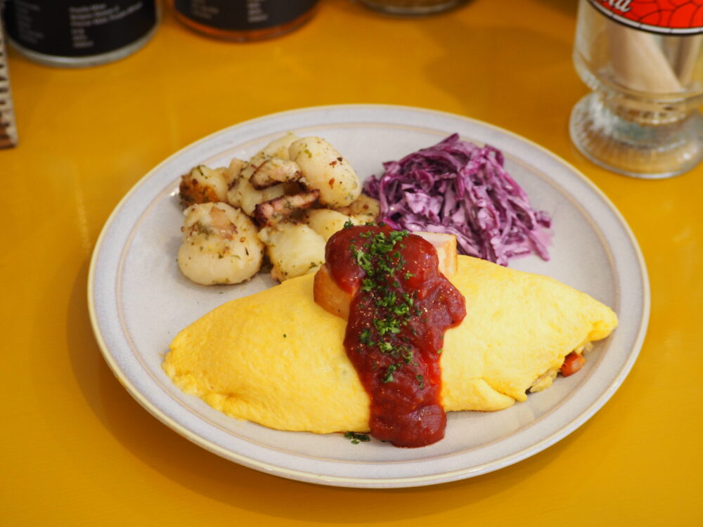 推薦者の松本が気になっていたというクラシックオムライス(1,300円)を注文しました。かかっているのは、ピリッとした辛さのチポトレケチャップで、半熟のたまご焼きとの相性が抜群。上に乗ったベーコンは店で燻製してつくっているそう。