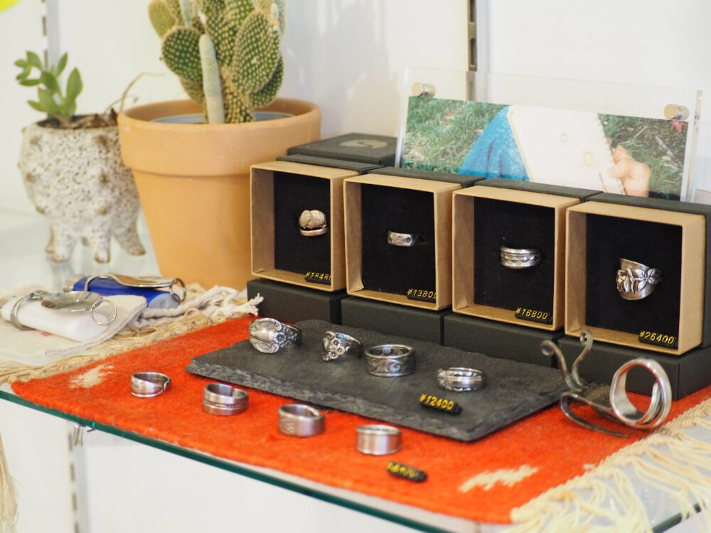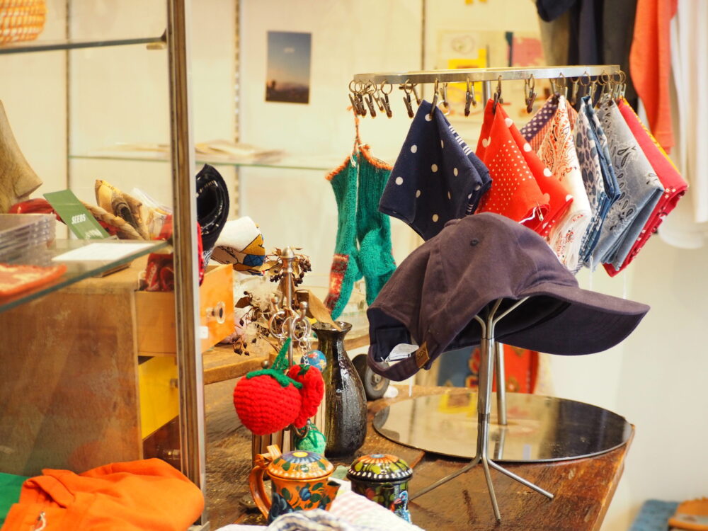 機能性のある服を意識して揃えており、アメリカ古着を買いつけることが多いとのこと。レディースとメンズはだいたい半々くらい扱っており、アクセサリー、雑貨、ハンカチなどの小物も取り揃えています。
