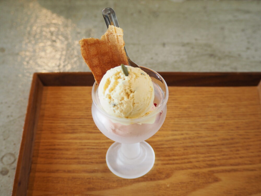 アイスは8種類ほどあって迷いましたが、いちご杏仁と季節のフレーバーであるパッションフルーツジンジャー(2種500円)を注文。いちご杏仁は、杏仁のまろやかなこくといちごの甘さが感じられ、パッションフルーツジンジャーは甘酸っぱさとともにスパイシーな香りがほのかに鼻に抜けます。この日の最高気温は28度で暑さにやられていましたが、しっかりと癒されました。ちなみにここではアイスが通年メニューで、季節ごとに旬の食材を使った限定フレーバーが登場するそうです。