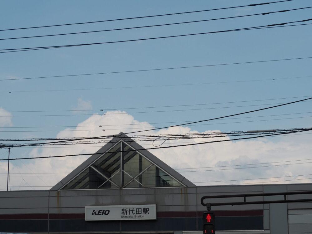 店を出ると、駅越しに夏の名残を感じるきれいな空が。