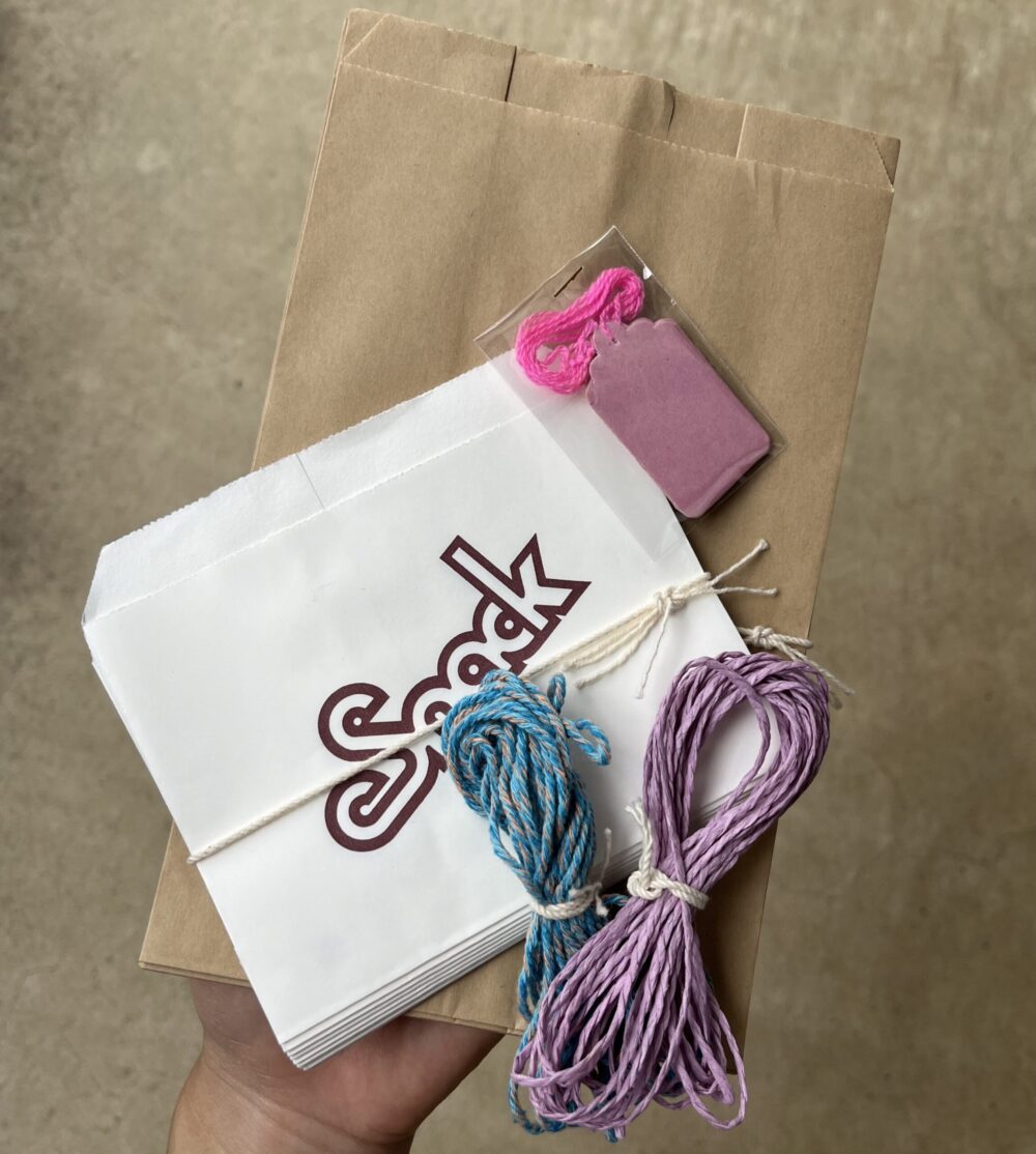 ちなみに私は茶色のクラフト袋(10枚入り/160円)、白色のSnack袋(10枚入り/120円)や紐(3m/各200円)、タグ(100円)を購入しました。ちょっとした贈り物をするときに使いたいです。