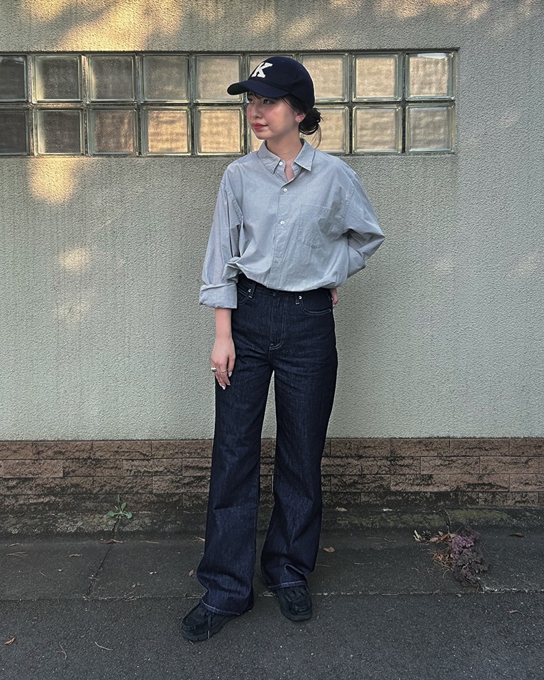 「ハリ感のあるシャツと、彼から拝借したキャップ、小指のシグネットリングでメンズっぽく。淡いブルーのシャツとインディゴブルーのデニムで、濃淡のメリハリをつけてみました」