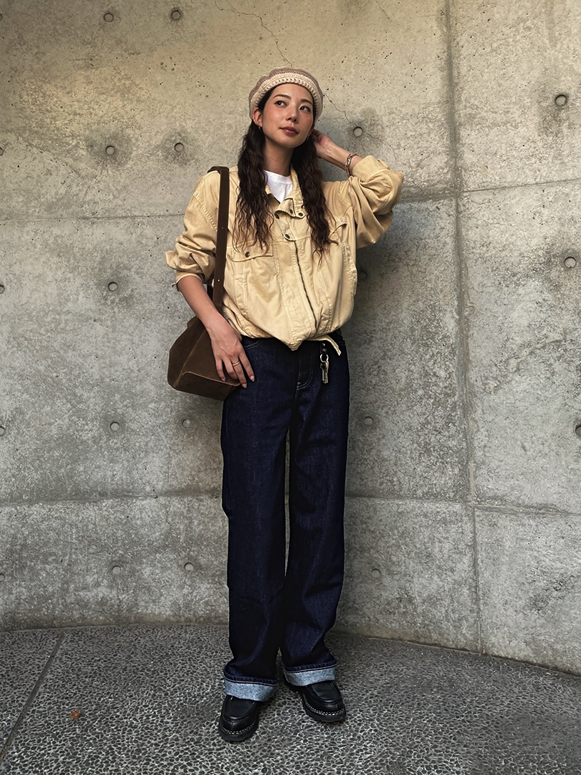 「濃紺のデニムに映える、イエローベージュのジャケットをチョイス。革靴やスエードのバッグで大人っぽさを出しつつ、クロシェ編みのニット帽でアクセントをつけました」