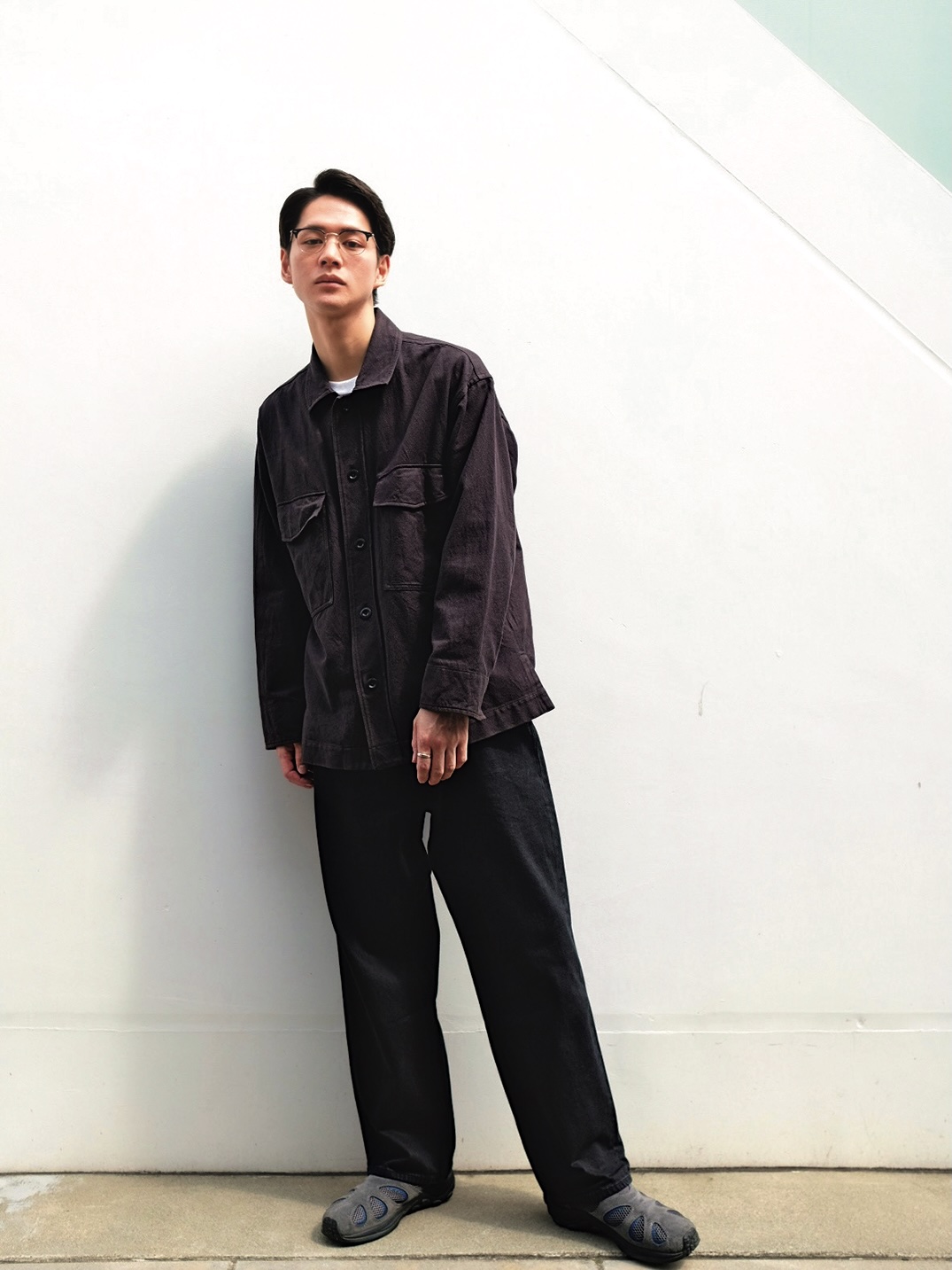「シャツジャケットを合わせてスマートなコーデに。渋さを加えられる<ユウイチトヤマ>のメガネは最近のお気に入り。足元はスポーティなスニーカーで抜け感をプラスしました」