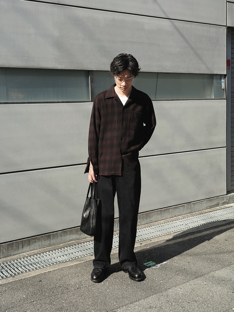 「季節感を意識してカシミア混の開襟シャツを主役にしました。ブラウンのチェックを引き立てるためにトップス以外は黒で統一。重くなりすぎないよう、インナーを白Tにしました」
