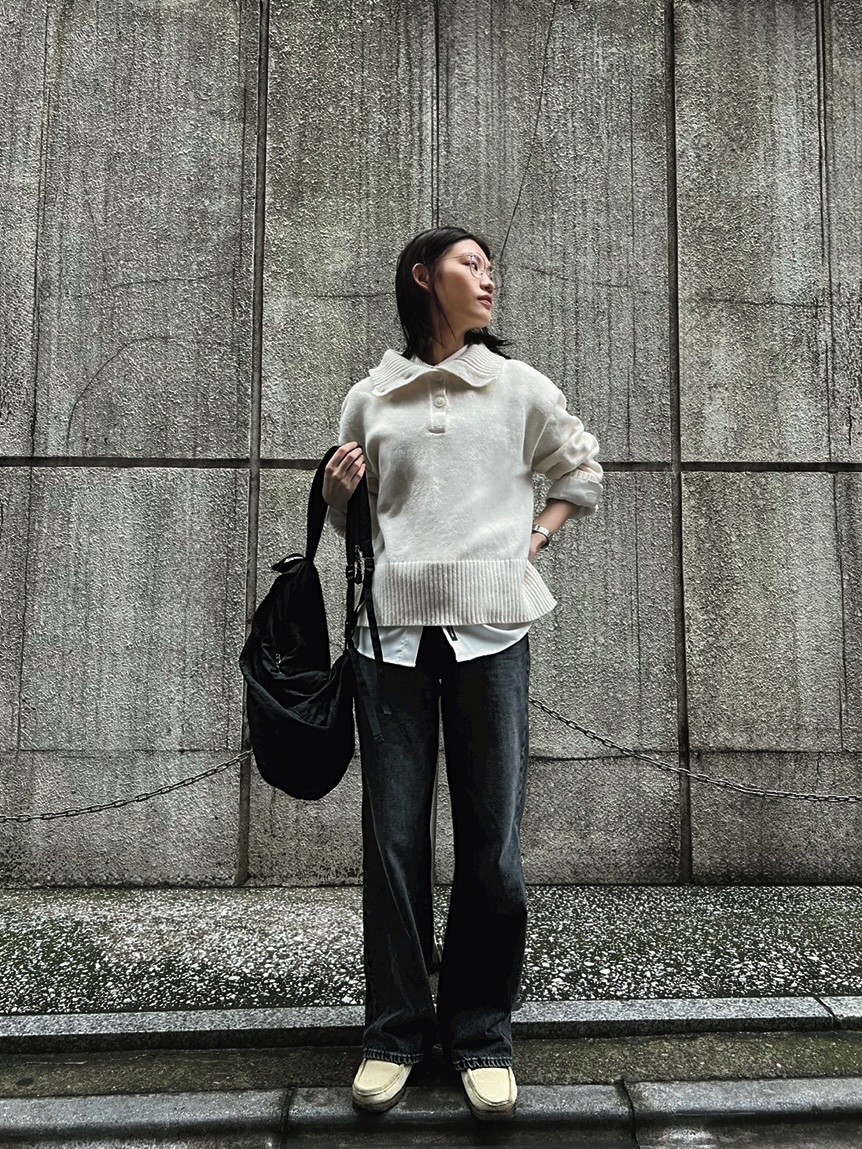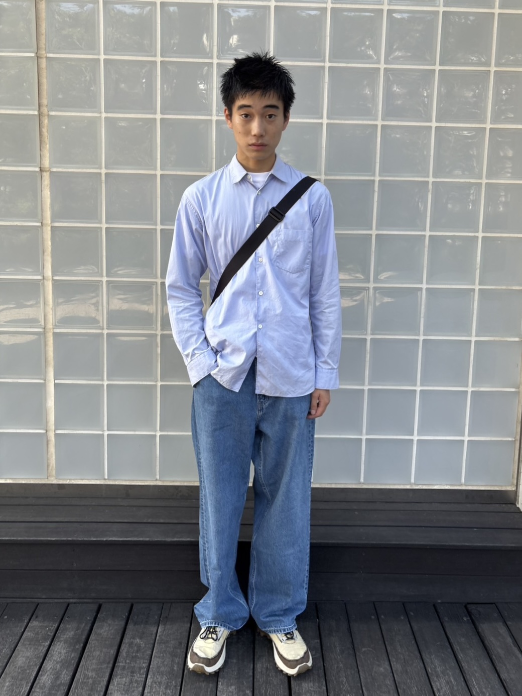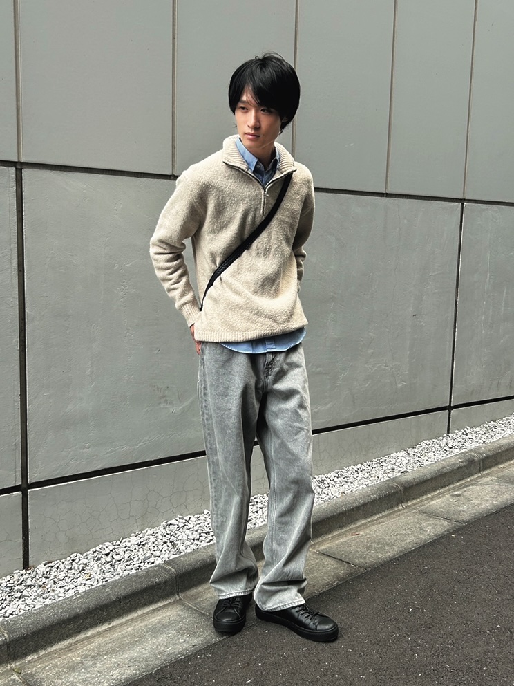 「クリーンな印象のライトグレーのデニムに合うホワイトのハーフジップに、水色のシャツを仕込んでアクセントに。バッグとスニーカーを黒で統一して全体を引き締めてみました」