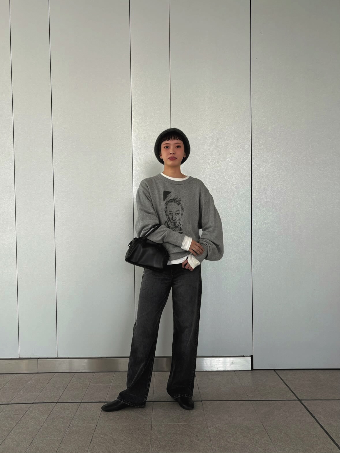 「グレーデニムの無骨な雰囲気に合わせて、メンズニットや革靴でクールにまとめました。男っぽくなりすぎないよう、丸みのある帽子やバッグで女性らしさを添えたのがこだわりです」