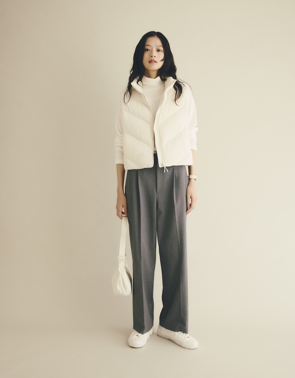 パンツ 3,990円、ベスト 5,990円、タートルTシャツ 1,990円、バッグ 1,290円/以上UNIQLO 時計 9,900円/ICE-WATCH(ビヨンクール) スニーカー 16,500円/REPRODUCTION OF FOUND(BRITISH MADE 青山本店)