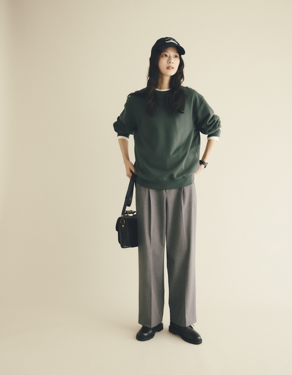スウェット 2,990円、Tシャツ 1,990円/ともにUNIQLO キャップ 9,350円/OLD SOLDIER(メイデン・カンパニー) 時計 57,200円/sazare(14 SHOWROOM) バッグ 74,800円/GLENROYAL(BRITISH MADE 青山本店) シューズ 71,500円/Paraboot(パラブーツ青山店)