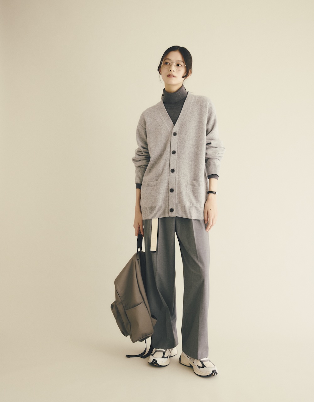 カーディガン 3,990円、ニット 3,990円/ともにUNIQLO メガネ 46,200円/金子眼鏡(オプティシアン ロイド) 時計 19,800円/MATOW(エイチエムエスウォッチストア 表参道) デイパック 9,790円/WILD WALLETS、 ベルト 2,090円/UNIVERSAL OVERALL(ともにTACHIYA) スニーカー 22,000円/New Balance(ニューバランスジャパンお客様相談室)