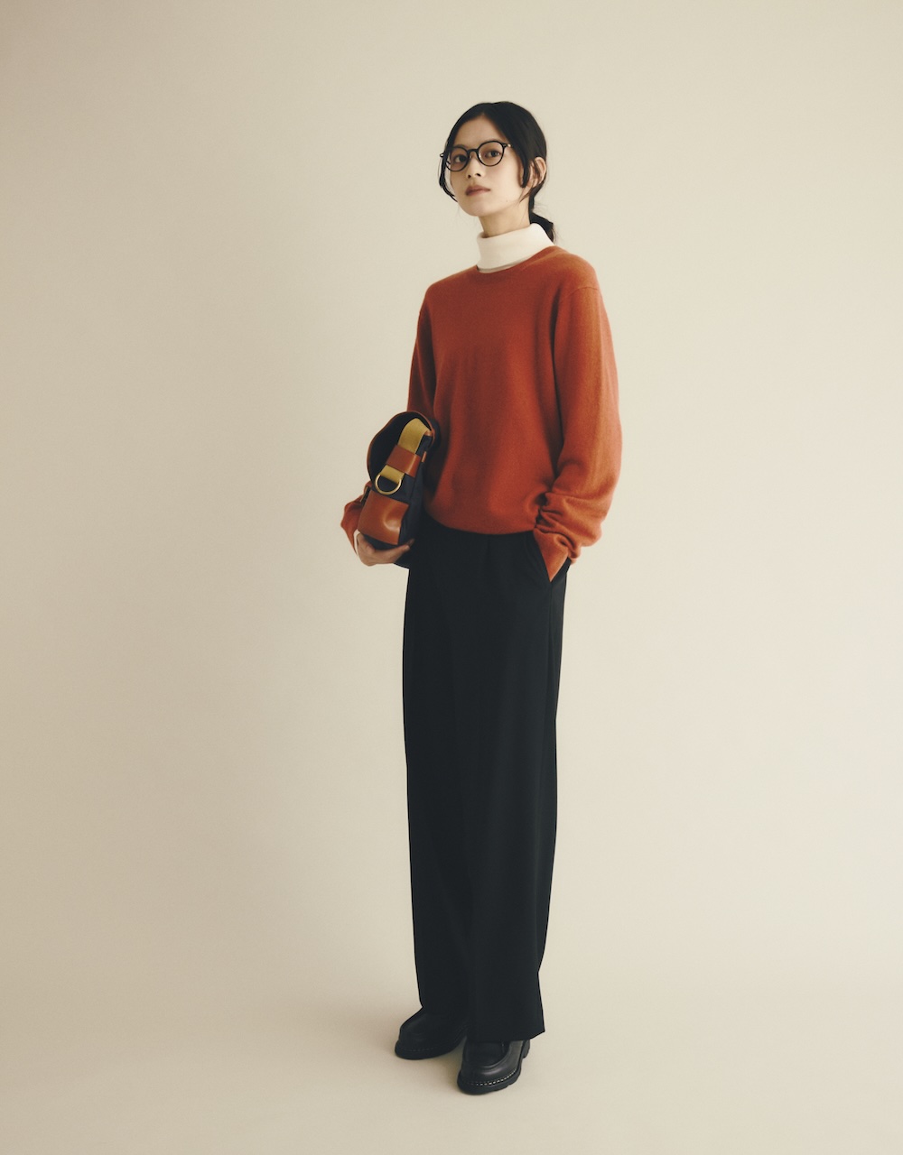 パンツ 3,990円、クルーネックニット(※一部店舗のみで販売)9,990円、タートルネックニット 3,990円/以上UNIQLO メガネ 19,800円/THE BEDFORD HOTEL(KING STAR) バッグ 44,000円/COTSWOLD AQUARIUS(メイデン・カンパニー) シューズ 94,600円/Paraboot(パラブーツ青山店)