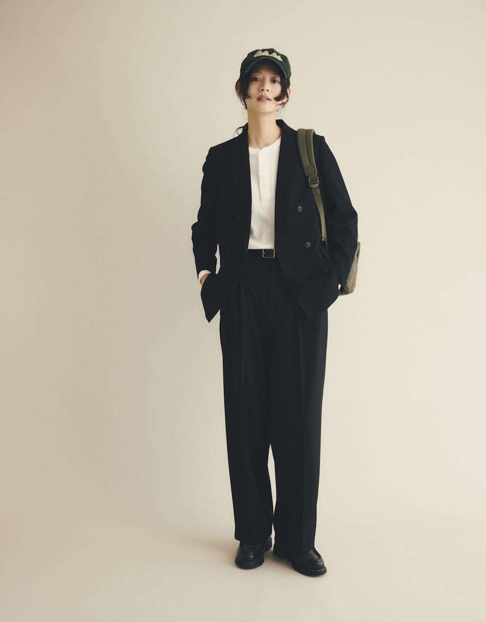 パンツは着まわし。 ジャケット 6,990円、Tシャツ 1,990円、ベルト 2,990円、バックパック 4,990円/以上UNIQLO キャップ 4,840円/H(アッシュ) ローファー 94,600円/Paraboot(パラブーツ青山店)