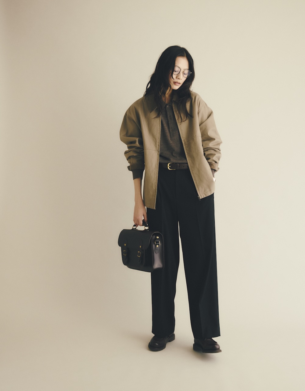 パンツは着まわし。ブルゾン 6,990円、ニット(※一部店舗のみで販売)3,990円/ともにUNIQLO メガネ 23,100円/TEL BEDFORD HOTEL(KING STAR) 時計 36,300円/lip(エイチエムエスウォッチストア 表参道) バッグ 91,300円/GLENROYAL(BRITISH MADE 青山本店) ベルト 4,290円/UNIVERSAL OVERALL(TACHIYA) シューズ 94,600円/Paraboot(パラブーツ青山店)