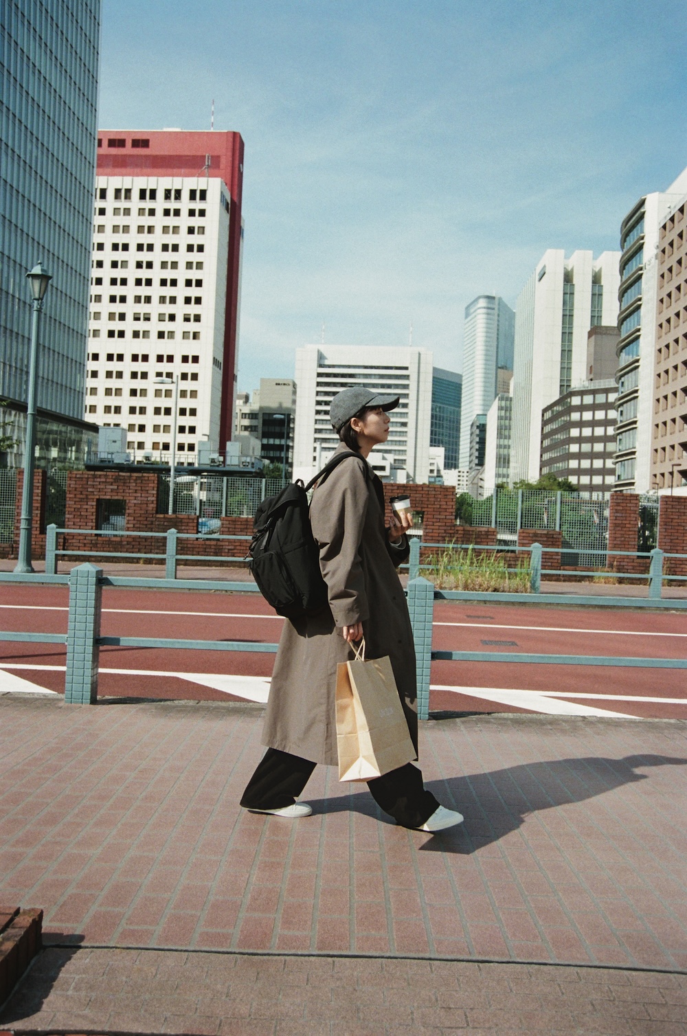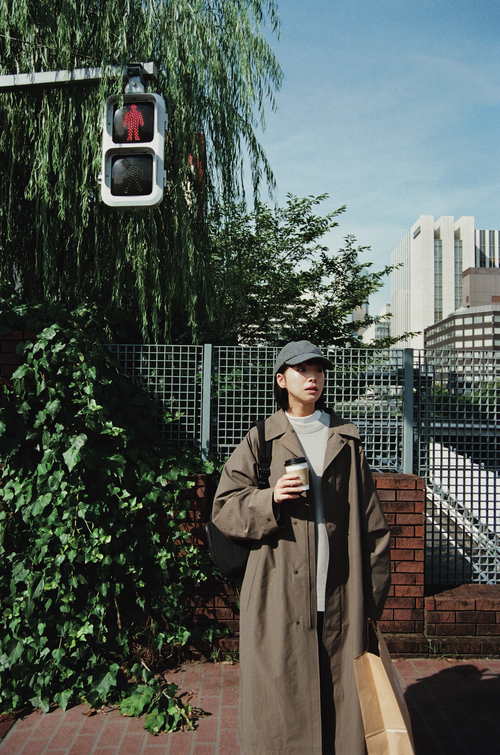 ステンカラーコート(メンズ) 12,900円、クルーネックロンT(メンズ) 2,990円、中に着たモックネックTシャツ(メンズ)1,990円、コーデュロイパンツ(メンズ)3,990円/以上Uniqlo U、ウールキャップ 1,990円、バックパック(メンズ)4,990円/ともにUNIQLO(以上UNIQLO)※コーデュロイパンツ、バックパック、ウールキャップを除く、すべてのアイテムは一部店舗のみ販売 スニーカー 35,200円/ YOAK(UTS PR)