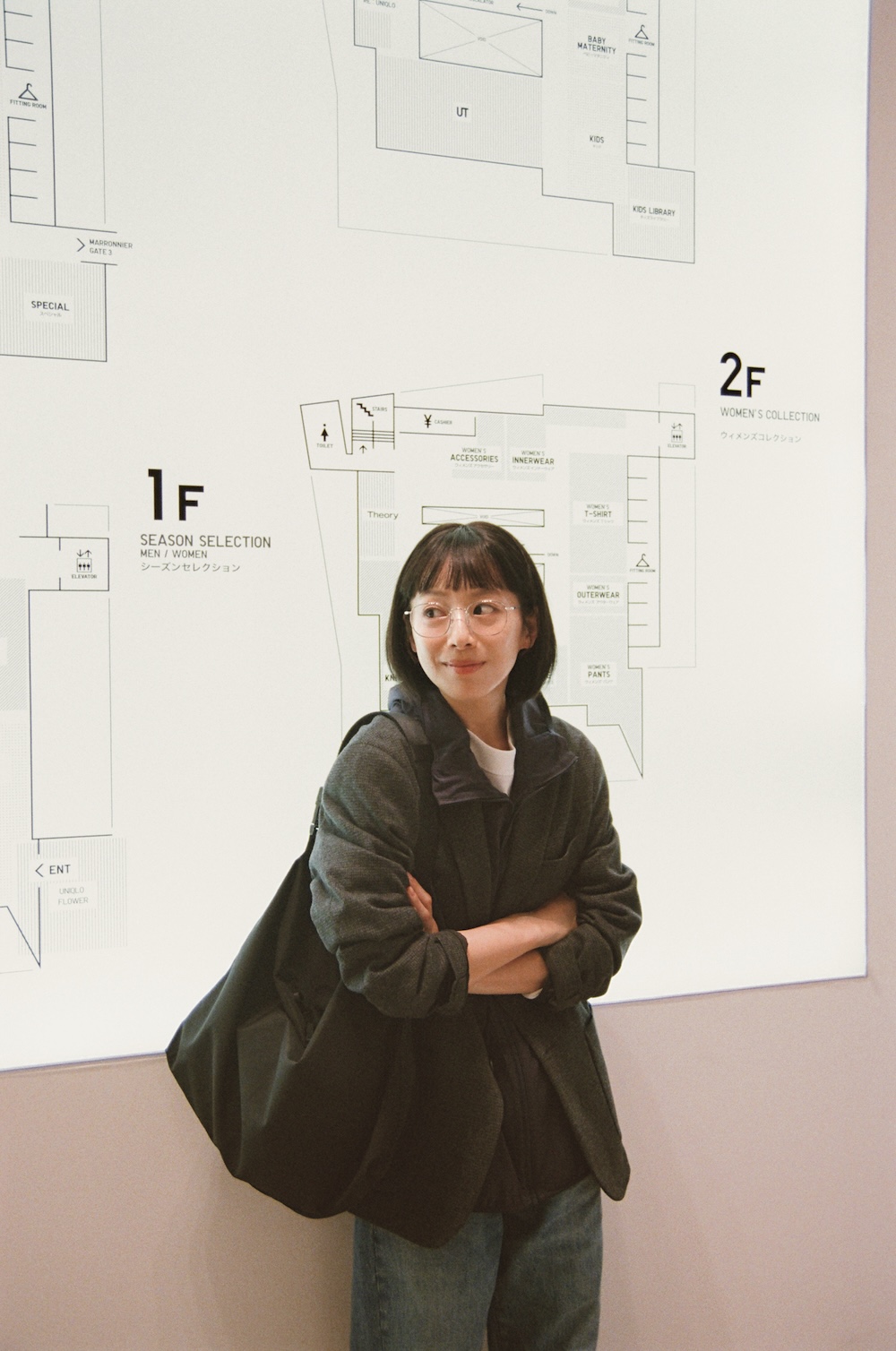 ジャケット(メンズ) 6,990円、ナイロンパーカ(メンズ) 3,990円/ともにUNIQLO、中に着たクルーネックロンT(メンズ)2,990円、ショルダーバッグ 2,990円/ともにUniqlo U※一部店舗のみ販売、デニムパンツ 4,990円/ UNIQLO and JW ANDERSON(以上UNIQLO)メガネ(フレームのみ)39,600円/白山眼鏡店(白山眼鏡店 WALLS)
