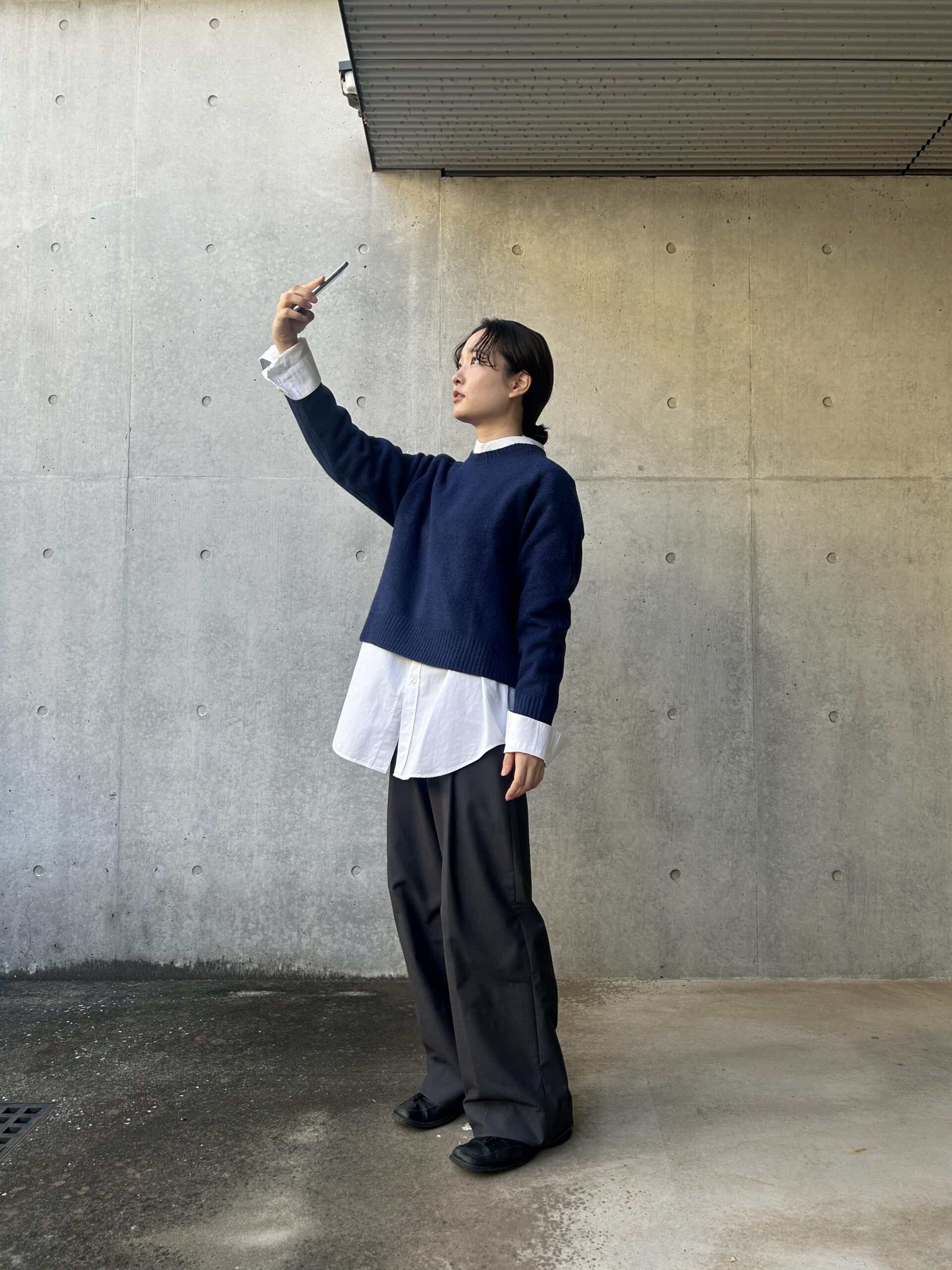 「ふわっとした質感や、ネイビーを引き立てるために、シックな色合いでまとめました。タックパンツとローファーで大人っぽさを意識。白Tで全体に軽さを出したのもポイントです」