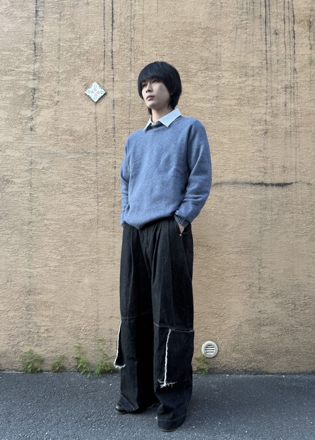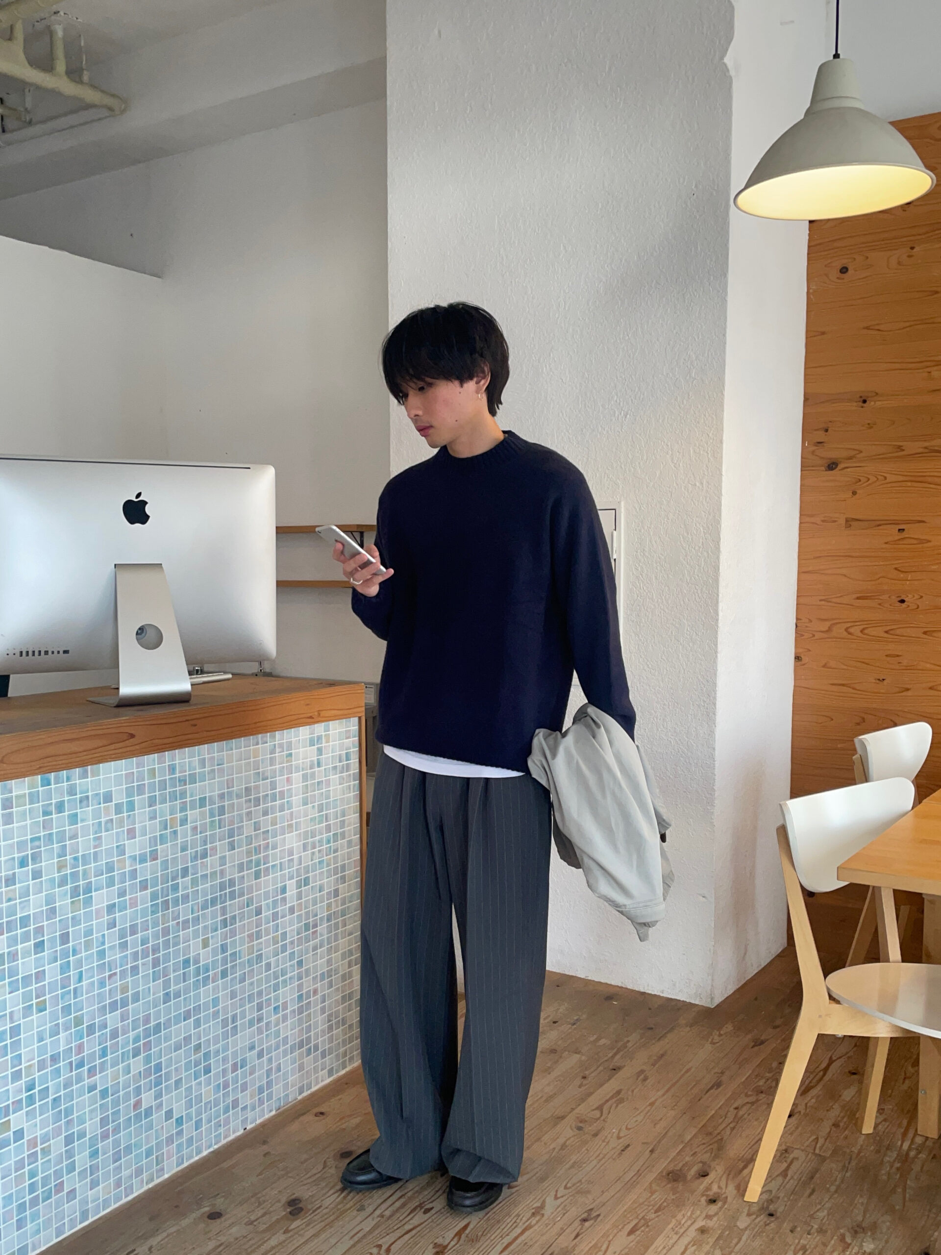 「ニットの青色を主役に色数を抑えました。どれもオーバーサイズなので、シャツを引き出してメリハリをプラス。スクエアトゥーシューズでシックにまとめたのもポイントです」