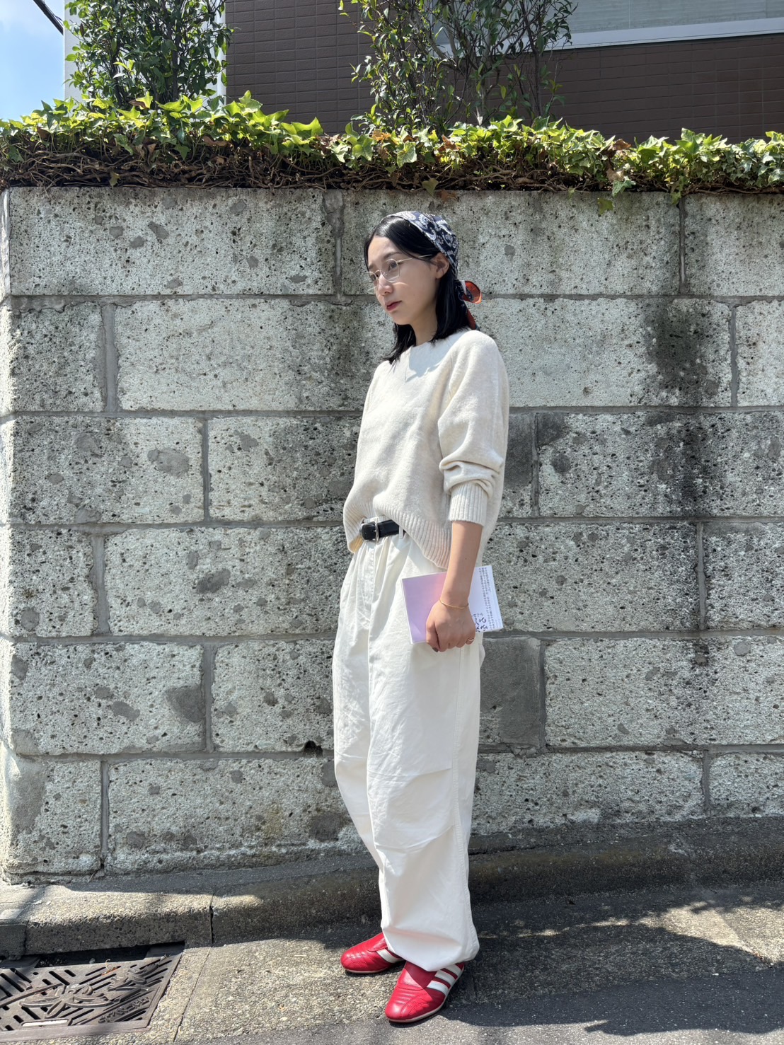「シンプルなホワイトコーデの差し色としてビビッドな赤いスニーカーをプラスしました。頭に巻いたバンダナは初挑戦。ほどよく個性を出せるのでプラスして正解でした ! 」