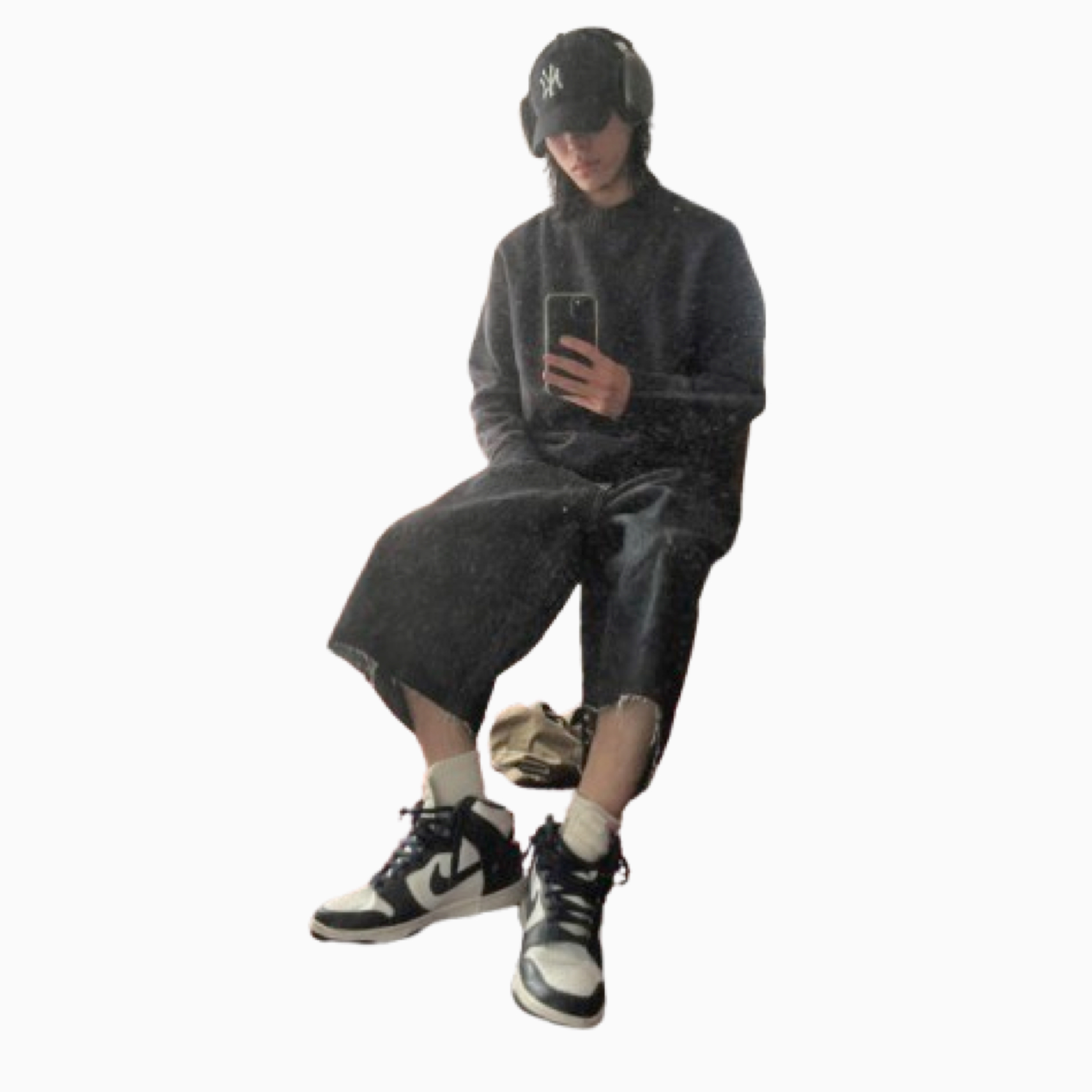 「シャツにニットを重ねた正統派な着こなしを、バギーパンツやハイカットスニーカーでストリートミックスに。テイストの違うアイテムを同系色でまとめて統一感を出しました」