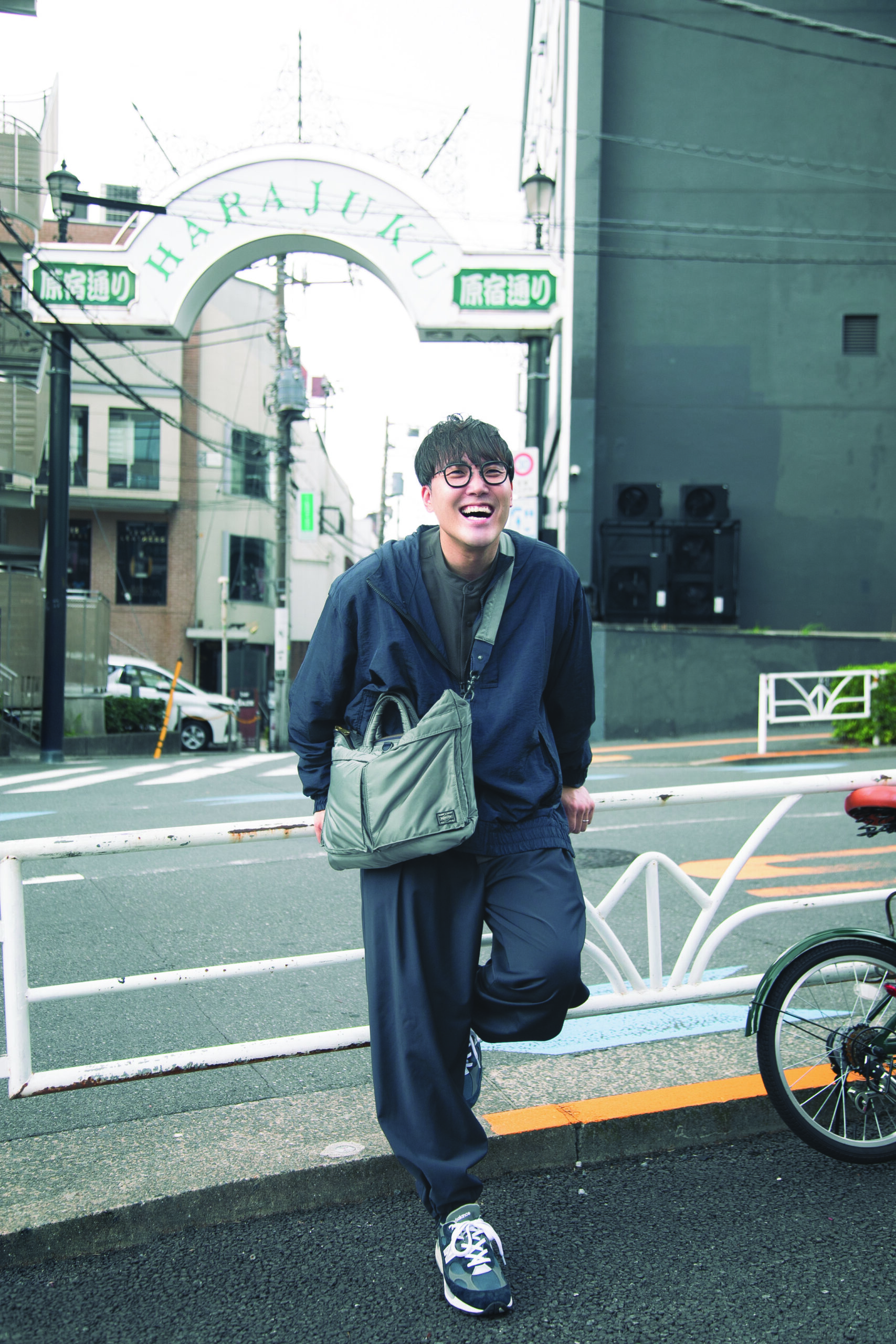 「ストリートやモードと、いろいろなテイストのファッションを経て、今はネイビーワントーンコーデがブーム。今日はチャコールグレーのTシャツを差し色にしました。変だと言われるんですが、トップスとボトムの生地の厚さを揃えるのがこだわり。揃っていないと違和感!」