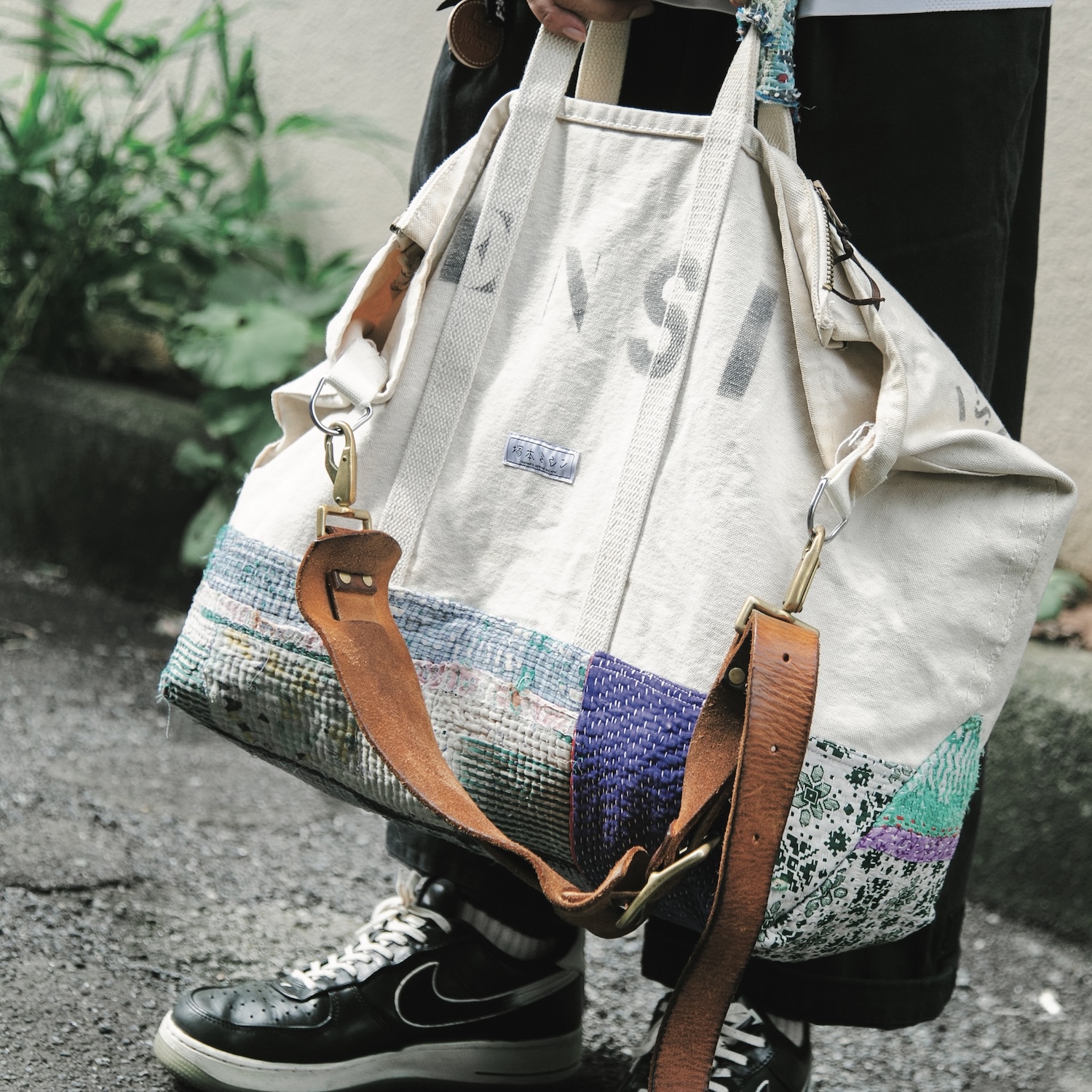 「先輩芸人のジンカーズの馬場さんにもらったトートバッグに、インドの伝統的な刺し子布、カンタキルトを縫いつけました。肩掛け用の革製ベルトをつけたり、開口部分にファスナーをつけて、使いやすさを追求しました」