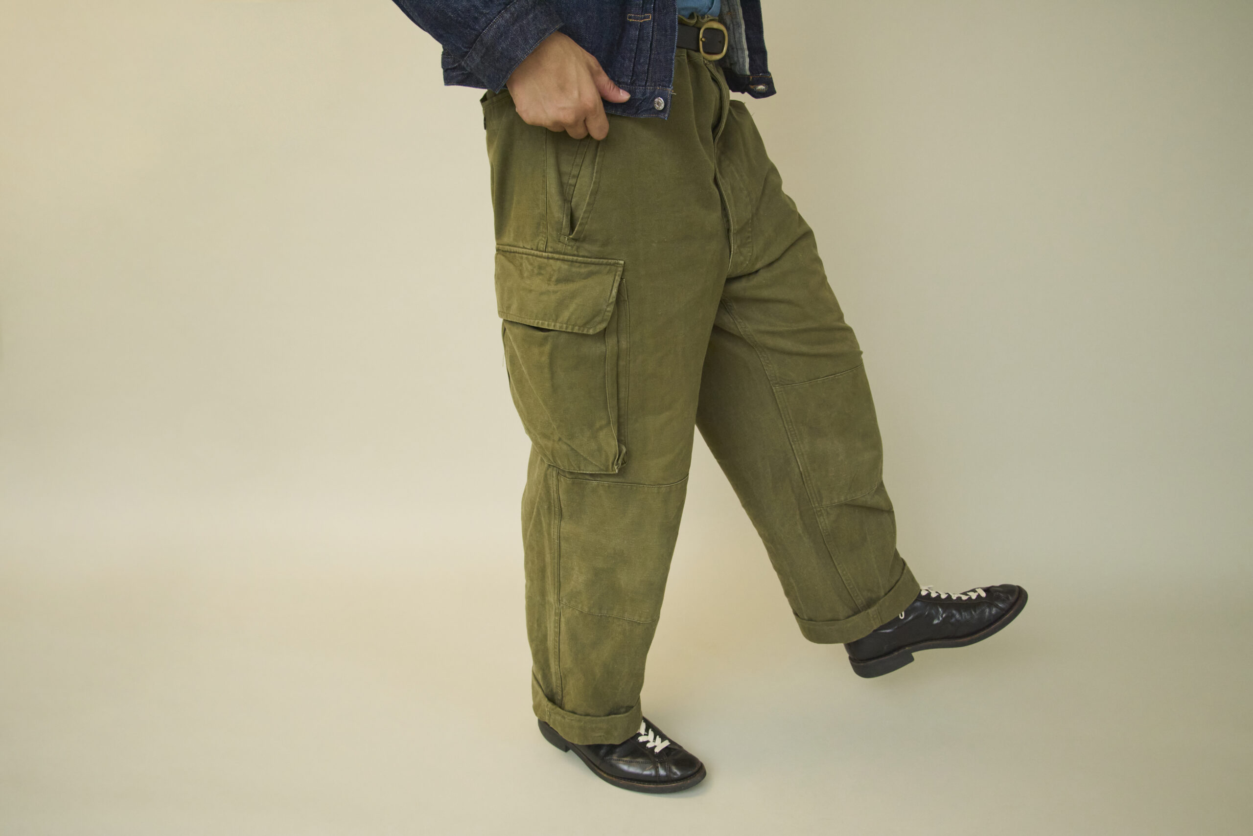 写真で着用しているフランス軍前期のカーゴパンツはデッドストックなので、古着特有の野暮ったさが出ない。