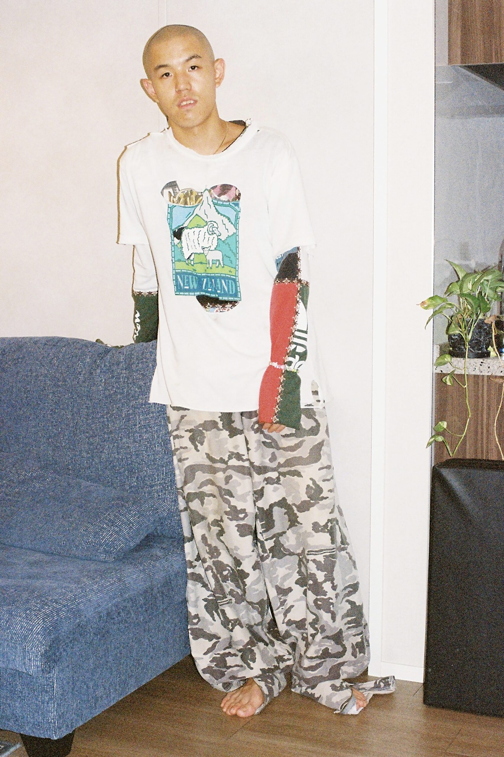 「ダメージのある古着って、数ある選択肢の中からわざわざ、意思を持ってそれを選んでいる一方で、着ればなんでもいいでしょっていう無頓着さもある。正反対の要素が同居している感じに魅力を感じるんです。あとスタイリングにも幅が出せますよね。1枚だけで着てもポイントになるし、今日みたいに穴の部分からインナーを見せるとか、レイヤードが工夫できる。今穿いている迷彩柄のパンツも、裾が裂けていたり、つぎぎの跡があります。数千円の“なんてことない”古着なんですけど、ブランドものにはない、唯一無二の表情があるんですよね」