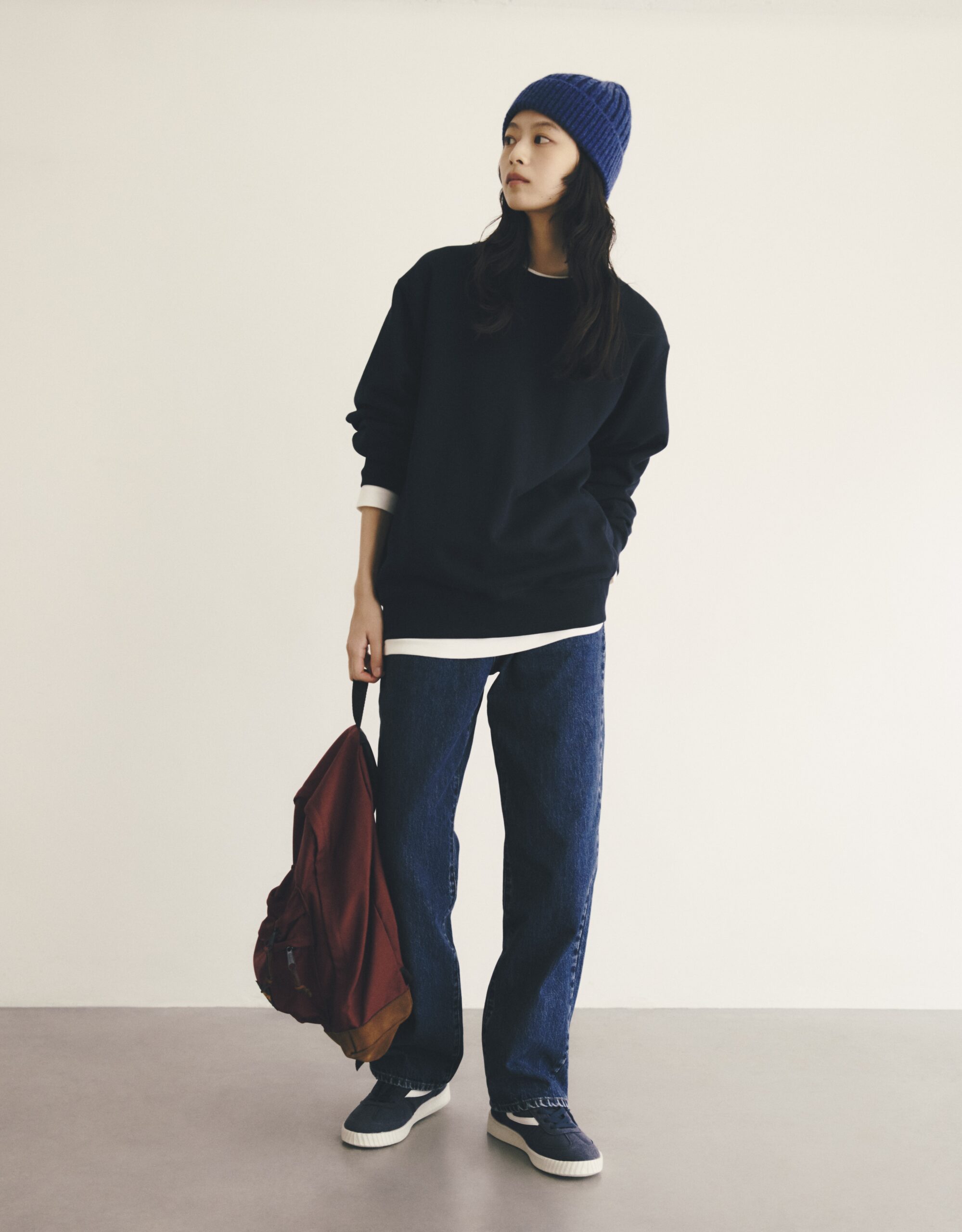 パンツは着まわし。スウェット 2,990円、Tシャツ 1,990円、ニット帽(※11月下旬発売予定)1,500円/以上UNIQLO ユーズドデイパック 9,900円/hickory スニーカー 5,390円/TRETORN(玉井産業)