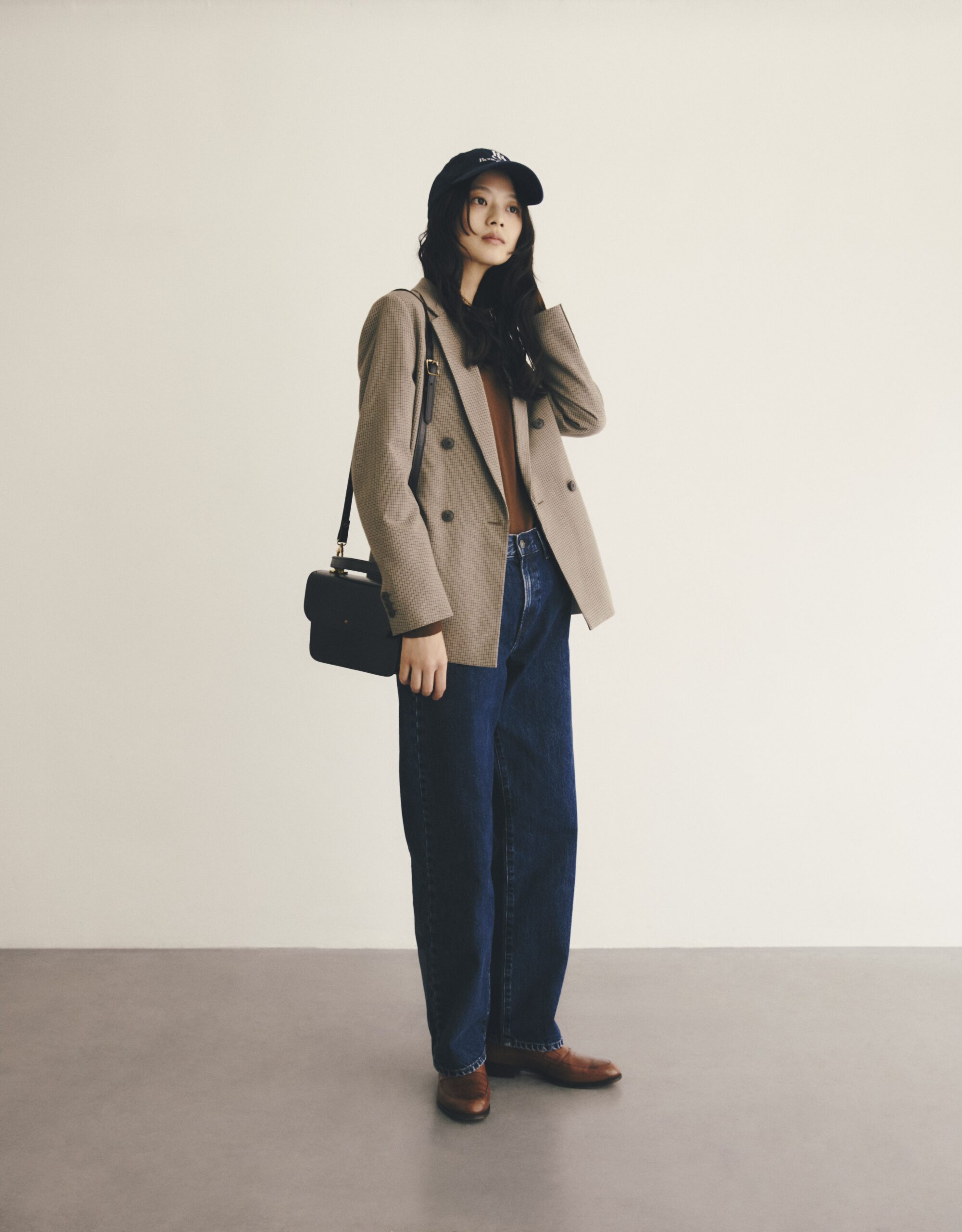 パンツ 4,990円、ジャケット 6,990円、ニット 3,990円/以上UNIQLO キャップ 6,380円/Progress Running Club(グラストンベリー ショールーム) バッグ 78,100円/GLENROYAL ローファー 79,200円/JOSEPH CHEANEY(ともにBRITISH MADE 青山本店)