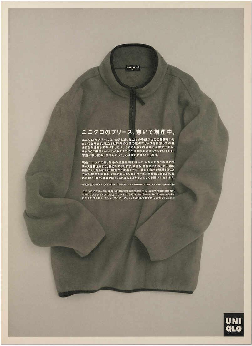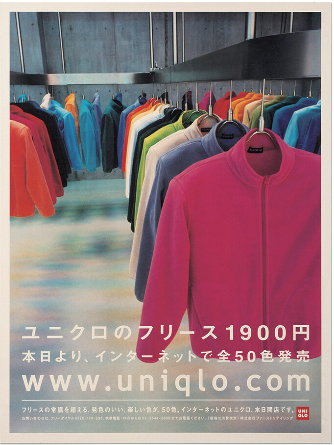 これは2000年に実施された「フリース50色キャンペーン」の新聞広告で、その名のとおり全50色のカラーバリエーションを打ち出して世の中を驚かせました。なかでも人気だったカラーはピンク。テレビCMで松任谷由実さんが着用したのがきっかけで、瞬く間に売れたんだとか。2009年のキャンペーンでは、全172アイテムをラインナップして話題になりました。フリースはインパクトのある数で認知を広げていき、人々の記憶に残る商品へと成長しました。