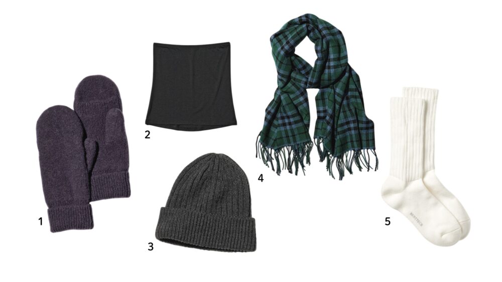 こんなものまでヒートテック! 1_ヒートテックライニングミトンスフレヤーン 1,990円(店舗限定販売)、2_ヒートテックボディウォーマー 1,290円(店舗限定販売)、3_ヒートテックリブビーニー 1,500円、4_ヒートテックマフラー 1,990円、5_ヒートッテックソックス ルーズ 590円