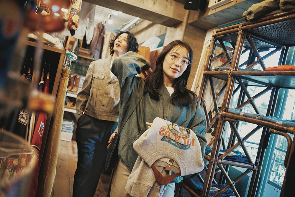 (Man)ユーズドのデニムジャケット 99,000円/FRONT 11201 中に着たユーズドのTシャツ 5,390円/SmallChange Koenji ユーズドのパンツ 3,850円/原宿シカゴ 神宮前店 シューズ 27,500円/Clarks Originals(クラークスジャパン)(Woman)ユーズドのジャケット 60,500円/DE CHIRICO 中に着たロンT 19,800円/HOLLYWOOD RANCH MARKET(ハリウッド ランチ マーケット) ユーズドのパンツ 27,500円/SAFARI 1号店 メガネ(フレームのみ) 37,400円/白山眼鏡店(白山眼鏡店 WALLS) バッグ 6,600円/BICASH(RAYAN)