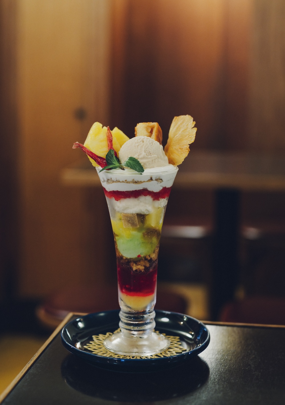 パイナップルのパフェ(ドリンクつき 3,600円〜)。使用するフルーツは季節ごとに変わる。