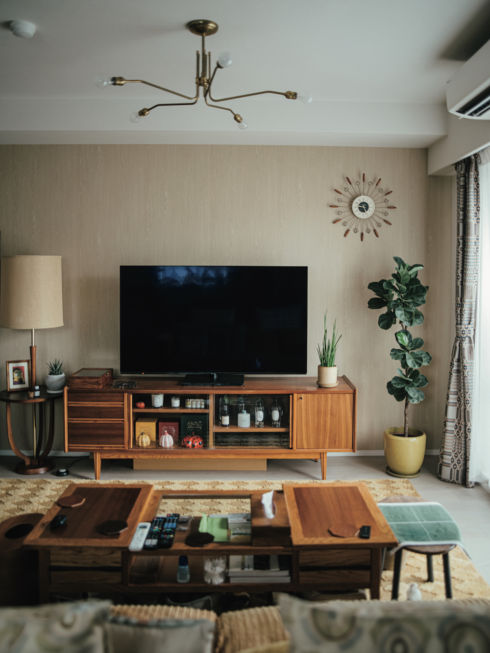 「家具だけじゃなくて照明やゴミ箱なんかも全部アクメで揃えましたね。カーテンやクッションの柄とか、ソファやカーペットの質感が、昔のアメリカ映画に出てくるいなたい部屋って感じでいいでしょう?『ストレンジャーシングス』みたいな」