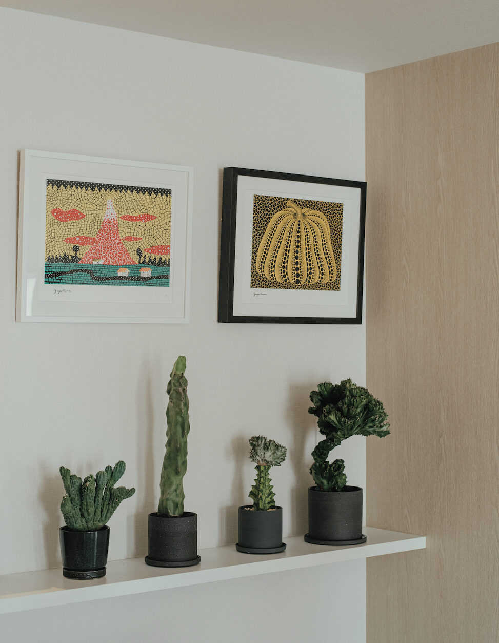 ダイニングテーブル横に、多肉植物やサボテンの仲間を飾っている。額装しているのは、草間彌生のシリアルナンバー入りの作品。