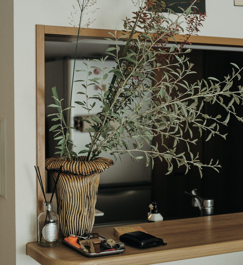 花瓶に生けたり壁や天井から吊るしたり。「オリーブの木は花屋さんで買って生けてます。花だとすぐに枯れちゃうので。ドライのあじさいを入れた古い水差しは水漏れするのでドライ用。ドライフラワー好きで、天井、壁、照明などいろんなところに吊るしてます」