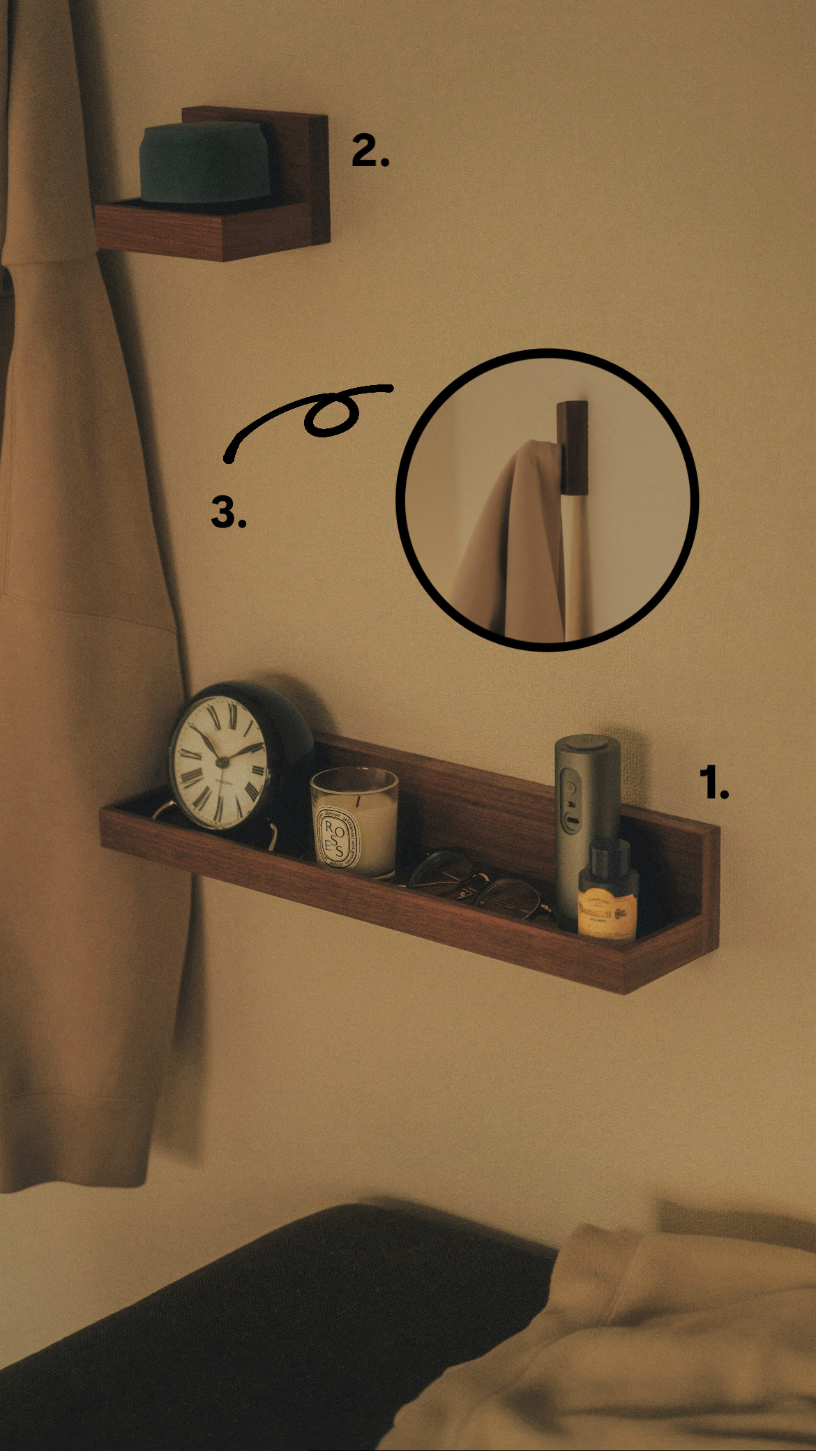 マグカップ、文庫本がすっぽり収まるサイズ感。上部にもスペースができるため、小さな植物や小物を置いたり、手が届くところに置いておきたいダスターの居場所としても。縦に取り付けることもできる。