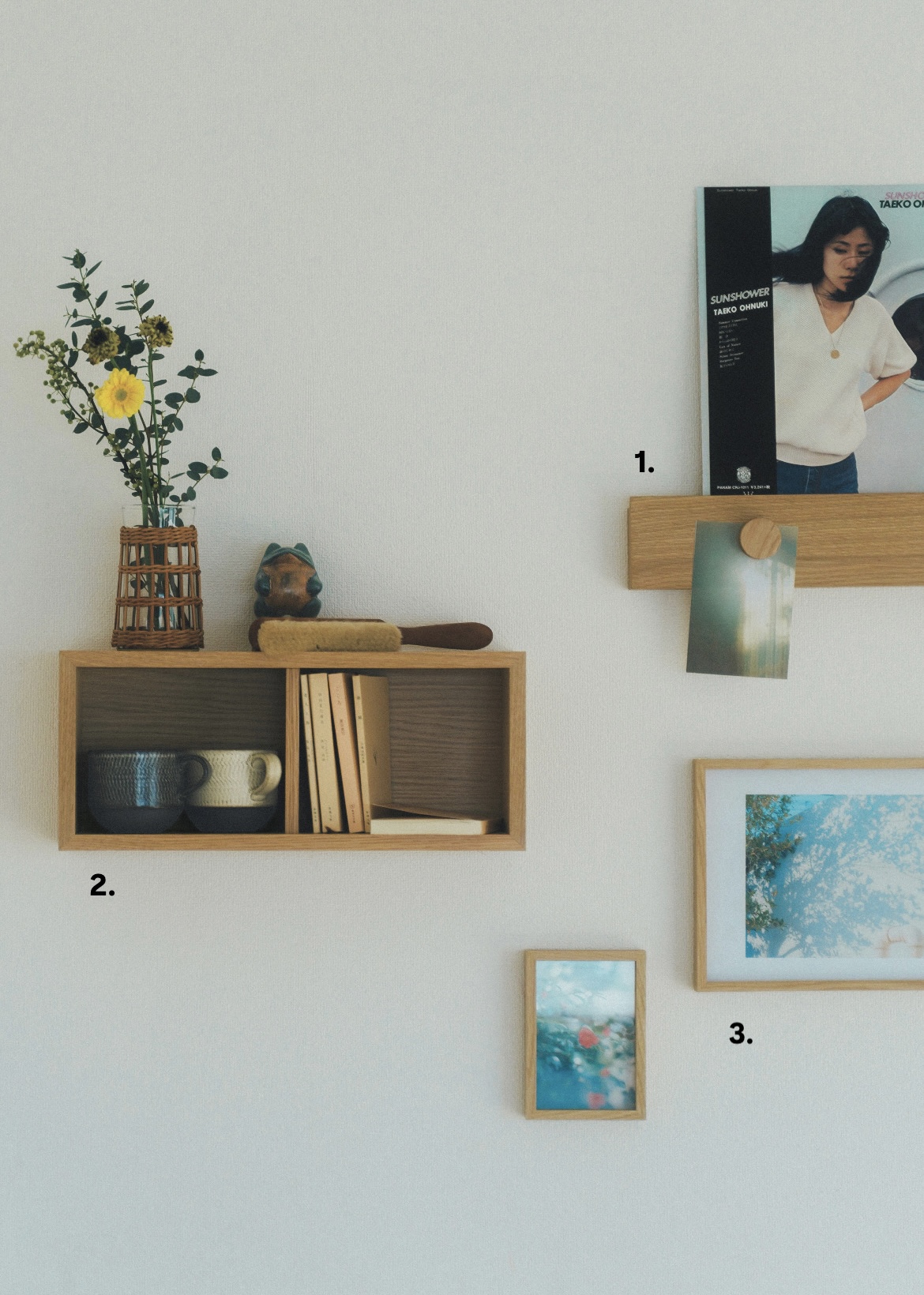 壁に付けられる家具と合わせて飾るのにおすすめなのが、木製フレーム。オーク材なので統一感が生まれる。「飾るものに合わせて、縦にしたり横にしたり見映えを考えるのも楽しいですよ」(野口さん)
