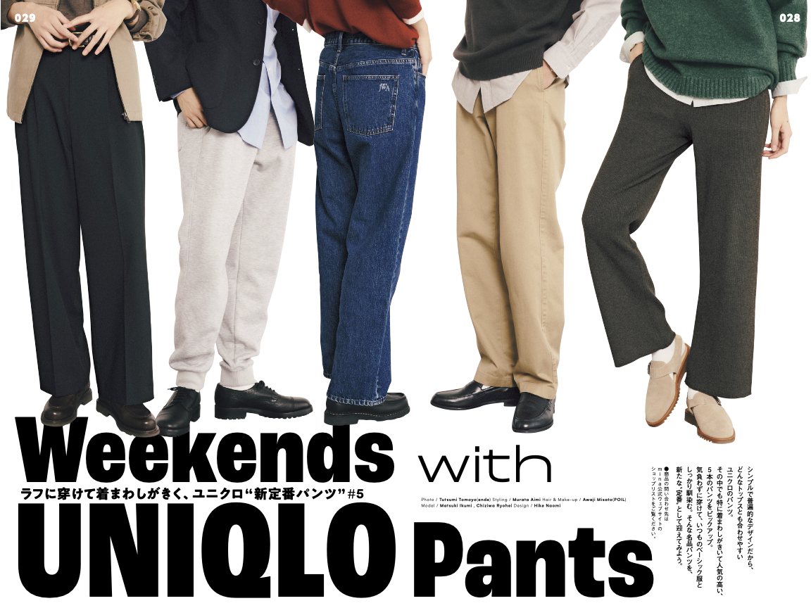 中でも今号では、週末のおでかけスタイルにもぴったりな、タックワイドパンツ、チノパン、デニムパンツ、ニットパンツ、スウェットパンツと5アイテムの着まわしを紹介しています。