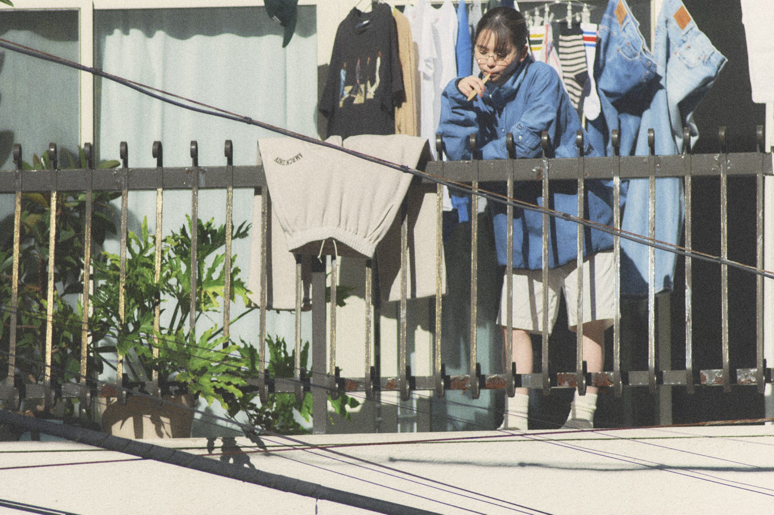 ベランダには洗濯物が揺れていて、その中にはUSEDのTシャツやリーバイスのデニムなど、過去の誌面で杏奈さんが実際に着用したアイテムも混ざっています。