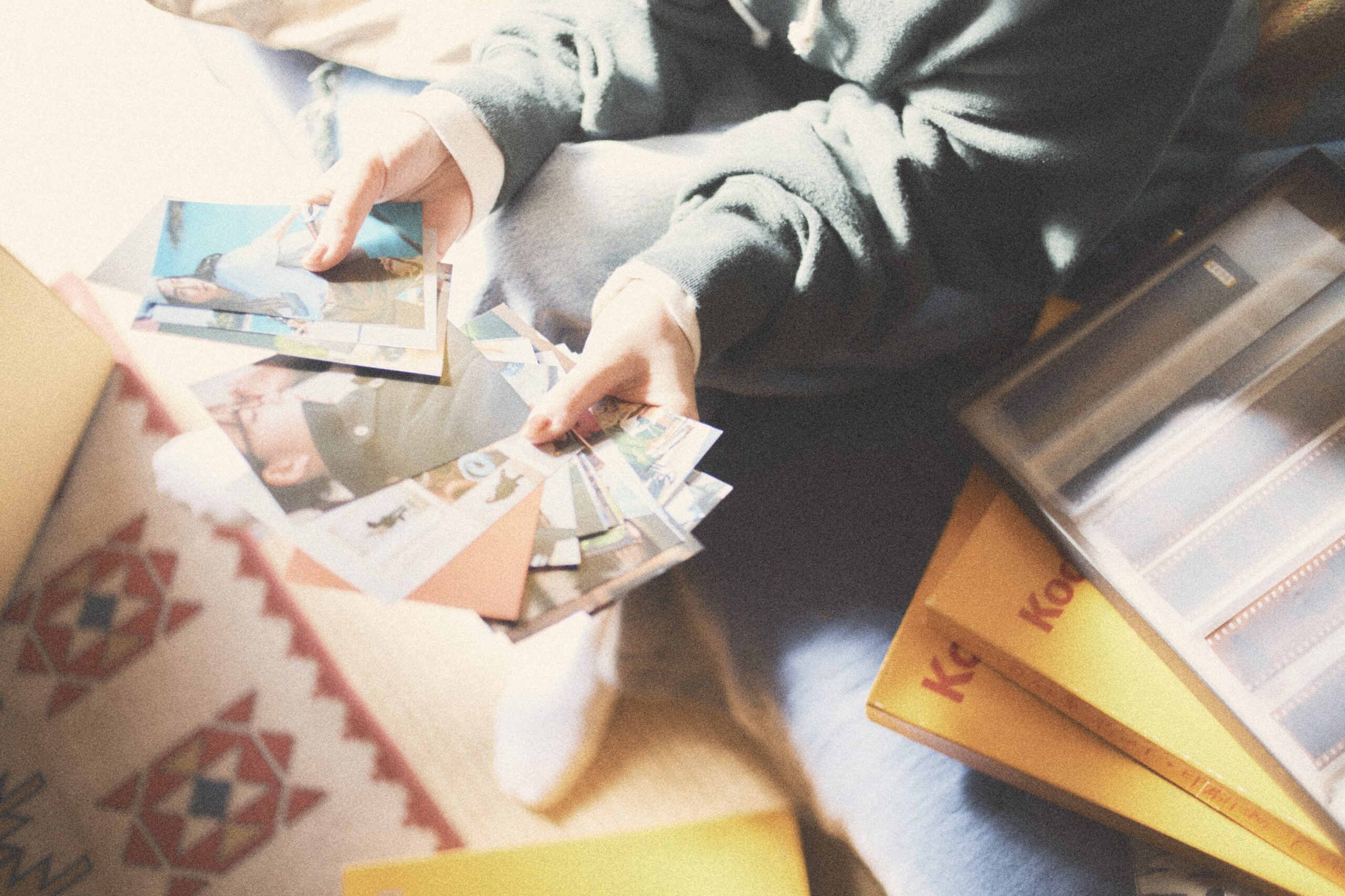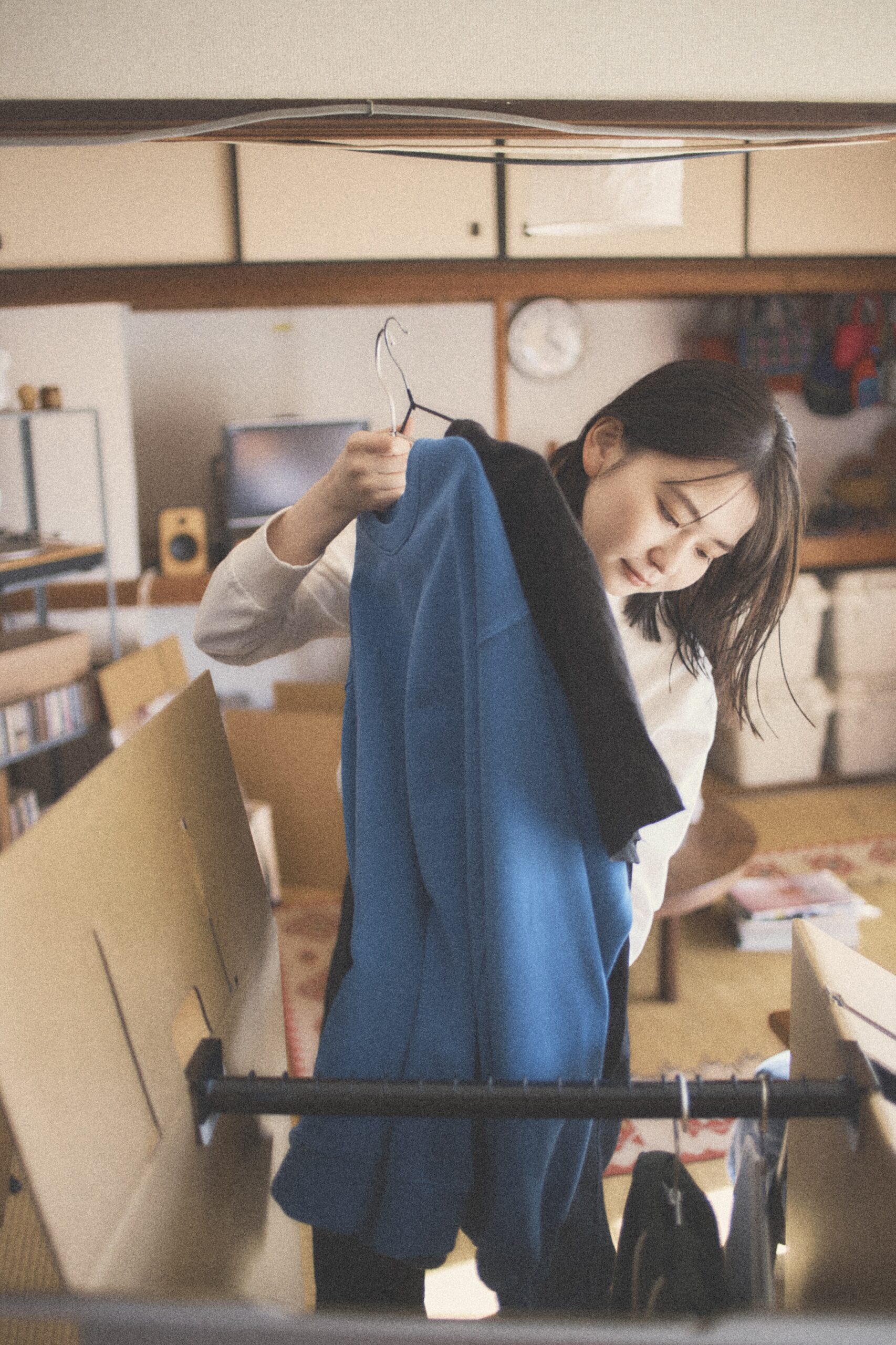 段ボールに囲まれた部屋で、杏奈さんには実際に荷造りをしてもらいました。引越しの日って、やることはたくさんあるのに、つい昔の写真や雑誌を眺めてしまうものですよね。