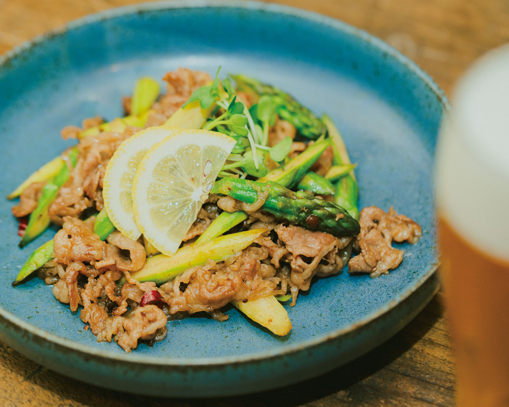 牛肉とアスパラをオイスターソースでさっと炒めて、粒山椒をピリッと効かせたビー ルのおつまみにぴったりの炒め物。 食もお酒もすすむ、しっかり濃いめの味つけがポイントです!