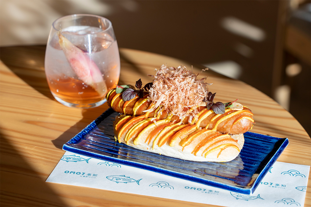 イチ押しメニューは「カツオドッグ(850円)」と「みょうがネード(650円)」。「カツオドッグ」はカツオの粉末を練り込んだソーセージにニンニクチップやカツオ節をトッピングし、カツオのたたき風で食べられるユニークなホットドッグです。そして「みょうがネード」は高知県が生産量No.1のみょうがのシロップ漬けが丸々一本入った斬新なドリンク! 恐る恐る食べてみるとみょうがのシャキシャキ感がとても美味しく、ソーダをより爽やかに引き立ててくれていました。