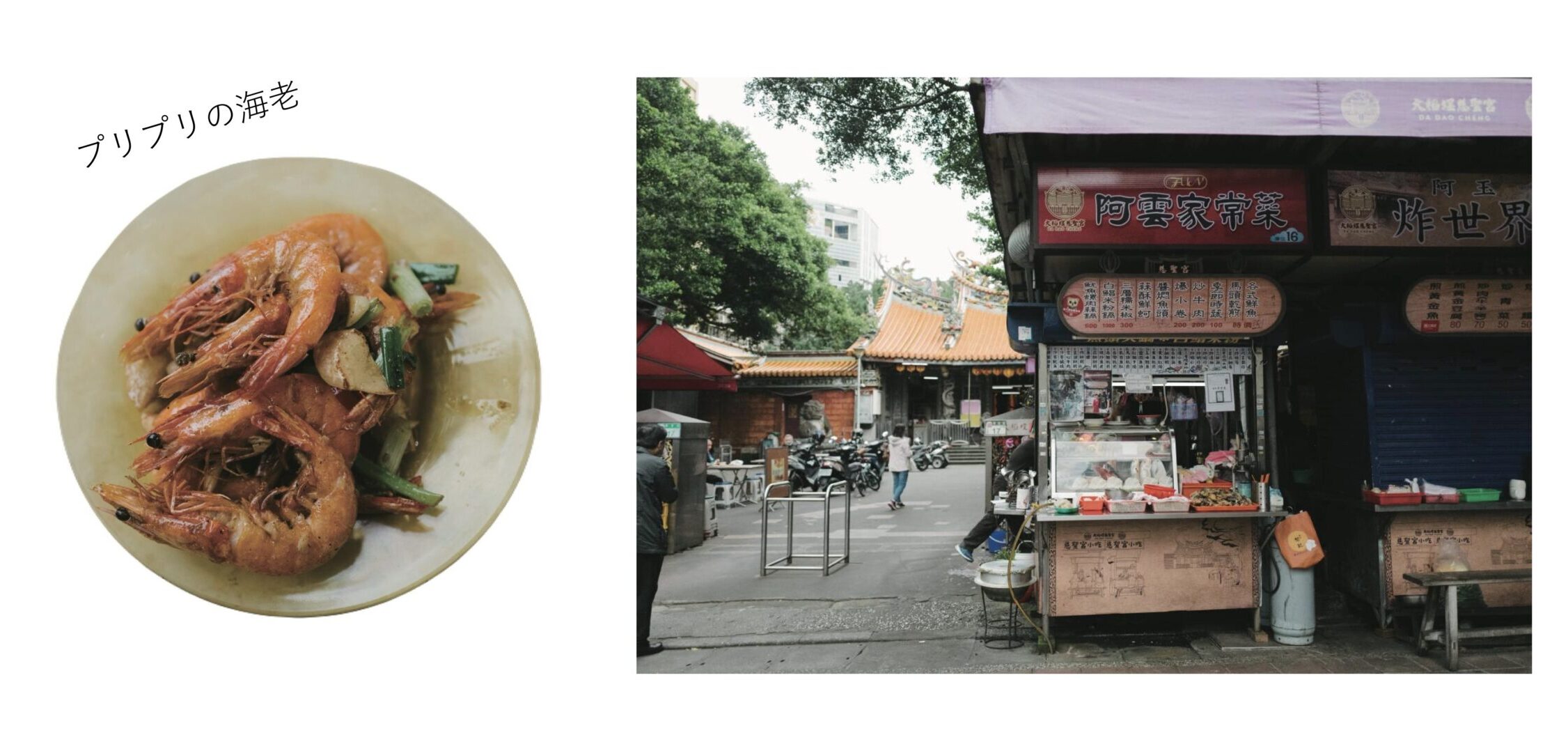 台湾各地に点在する廟(びょう)やお寺の周辺には、美味しい屋台が集まる。大稻埕(ダーダオチェン)は、人気観光地、迪化街(ディーホアジェ)を中心に広がるエリアで、かつて貿易で栄えた歴史ある街。慈聖宮(シェンゴン)の境内には立派なガジュマルの木があり、その下で参道沿いに並ぶ屋台グルメを楽しめる。シラスたっぷりの炒飯や、豚スペアリブと大根のスープなどが人気。